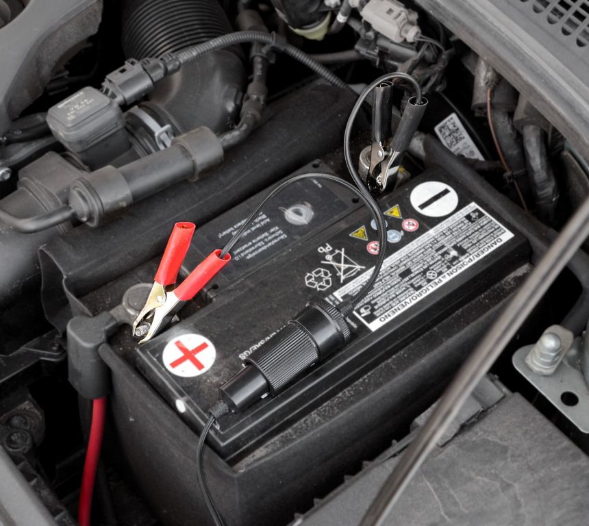 Gniazdo do standardowej zapalniczki samochodowej z zaciskami do podłączenia bezpośrednio do akumulatora samochodowego.