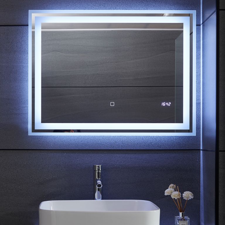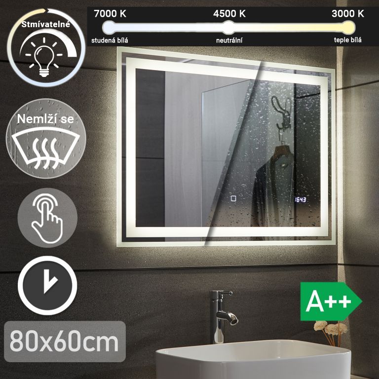 Te podświetlane lustra łazienkowe są wyposażone w cyfrowy zegar z ustawianiem daty i funkcją anti-fog, która włącza się automatycznie po włączeniu świateł LED. Lustra dotykowe z funkcją ściemniania zapewniają specjalne oświetlenie pomieszczenia zgodnie z Twoim nastrojem: ciepłe 3000K, zimne 7000K lub nawet neutralną białą diodę LED 4500K.