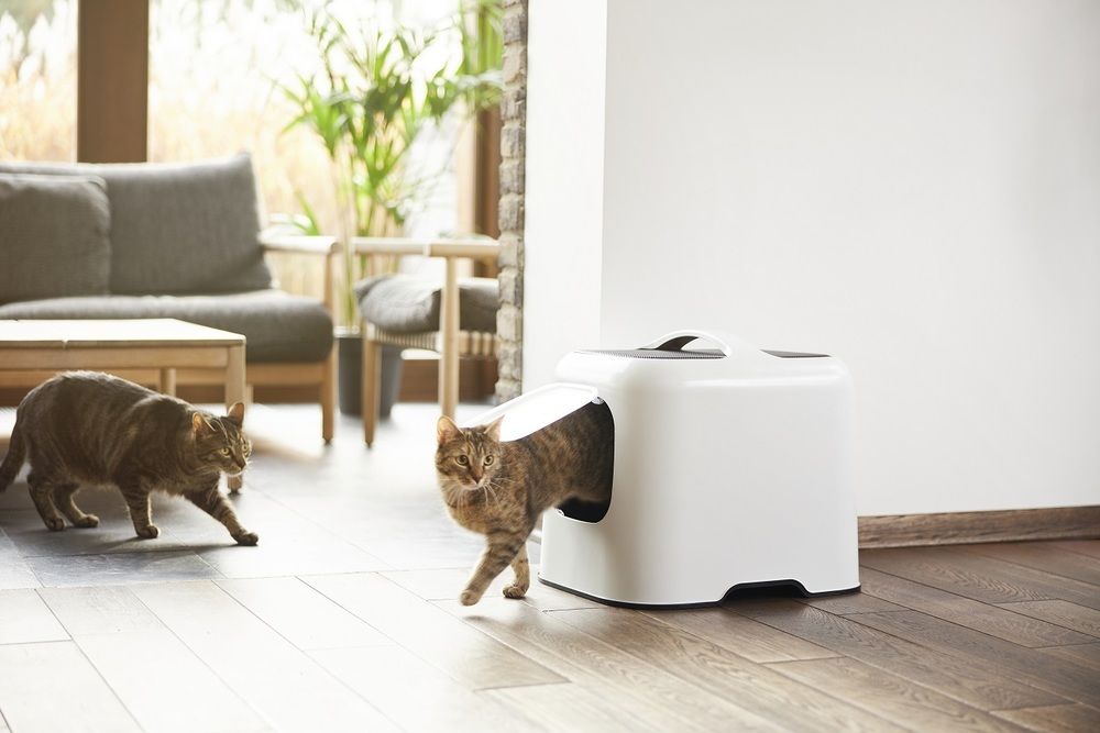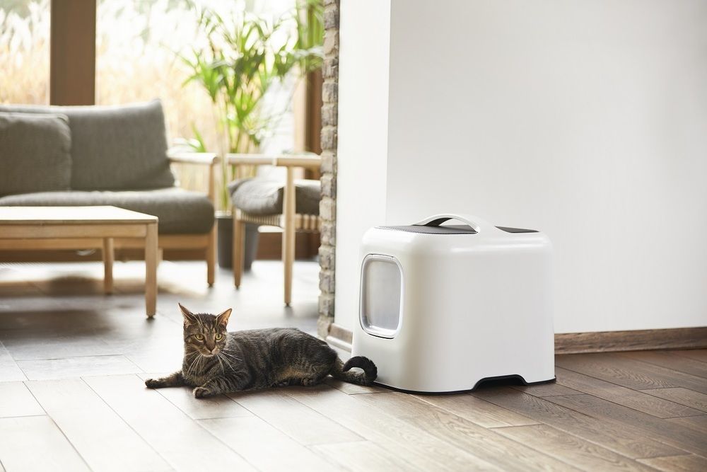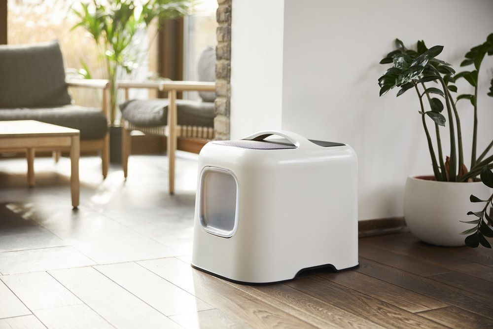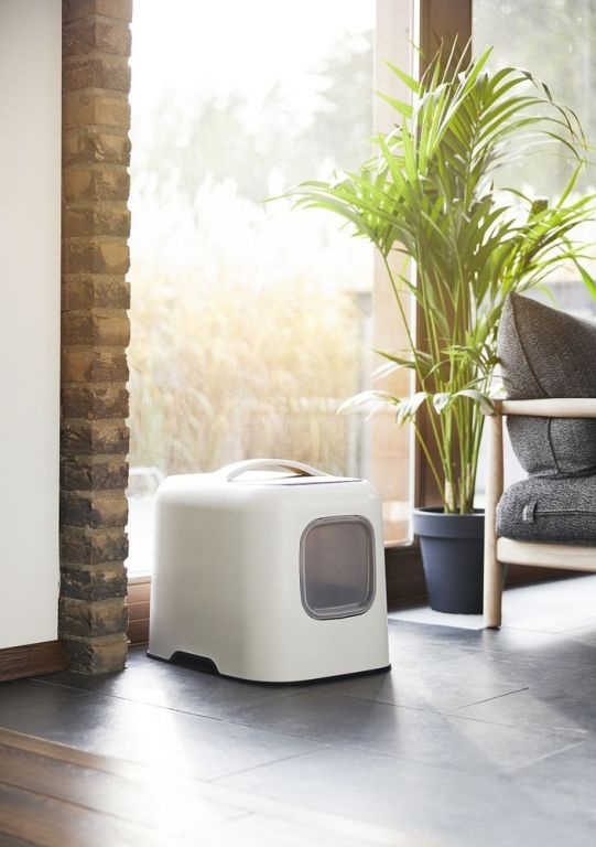 Toaleta dla kota BIALA wykonana z plastiku pochodzącego z recyklingu. Można ją umieścić w dowolnym miejscu w pokoju.