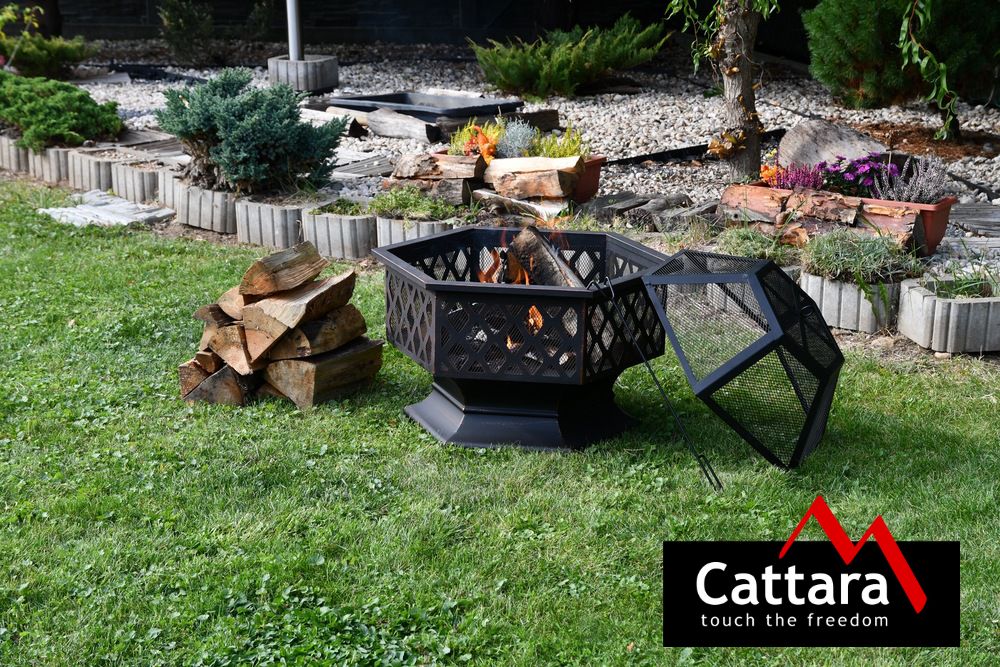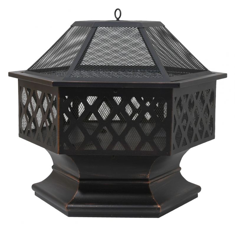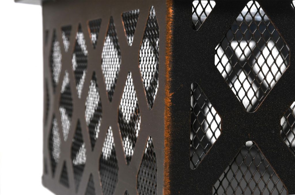 Przenośny kominek na drewno HEXAGON o sześciokątnej konstrukcji odpowiedni do tarasów i ogrodów. Konstrukcja kominka wykonana jest z wysokogatunkowej stali pokrytej wysokotemperaturową powłoką czarno-miedzianą z patyną. Do grillowania kominek wyposażony jest w stalowy ruszt o wymiarach 61x53 cm. Specjalnie ukształtowana osłona z siatki służy jako ochrona przed iskrami, co znacznie zwiększa bezpieczeństwo i komfort. Dodatkowo kominek wyposażony jest w solidną podstawę, dzięki czemu jego umiejscowienie upiększa przestrzeń.