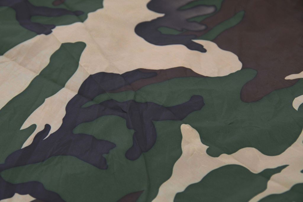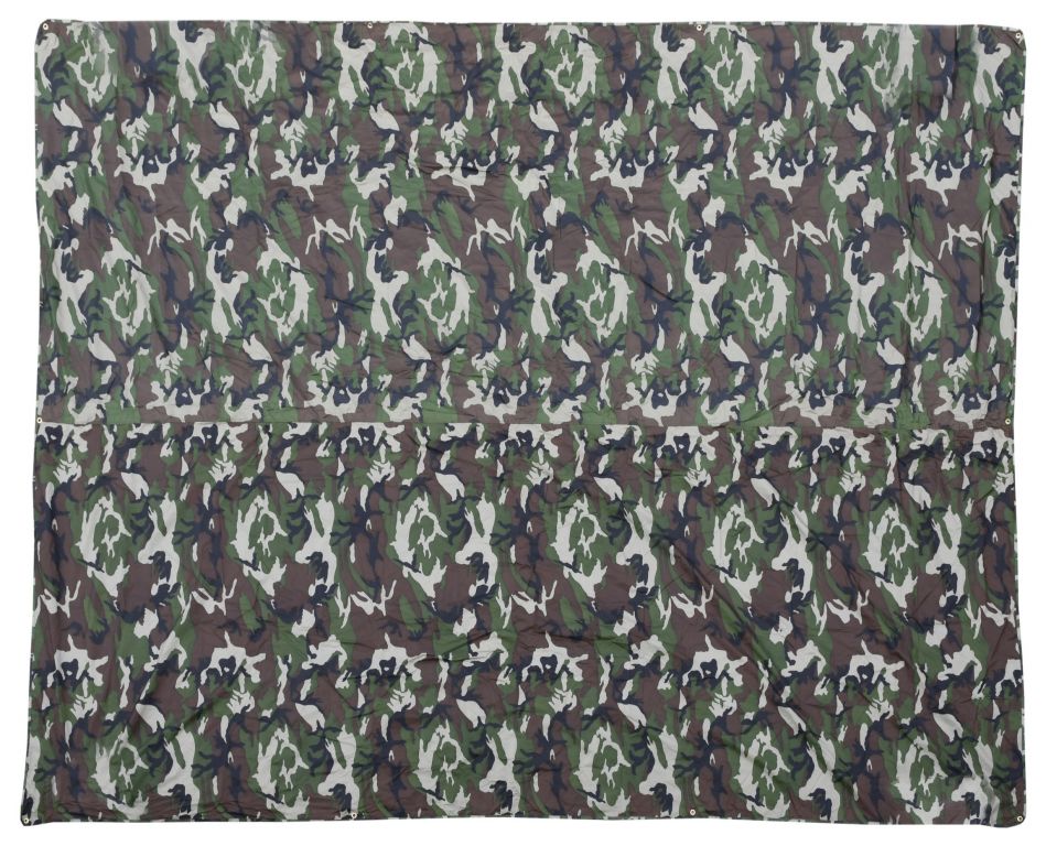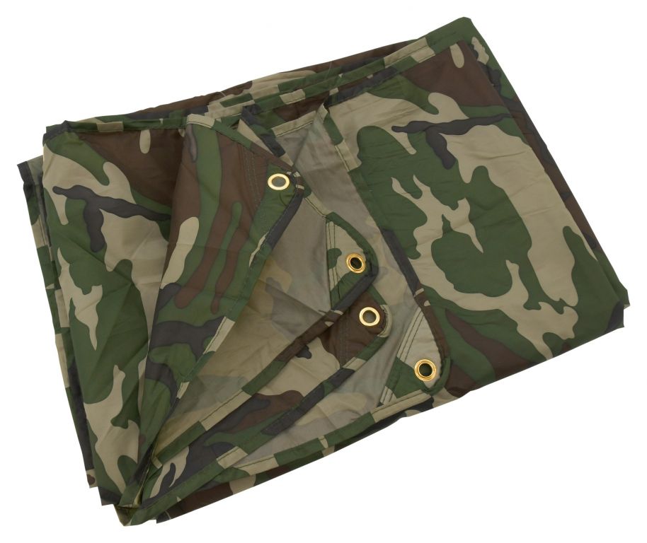 Lekki namiot w leśnym kamuflażu o wymiarach 3 x 4 m. Materiał wykonany w 100% z poliestru wraz z podklejonymi szwami zapewnia wodoodporność. Materiał został przetestowany przy słupie wody 2000 mm. Namiot wyposażony jest w oczka, dzięki czemu namiot może służyć (np. przy pomocy kijków turystycznych) jako schronienie lub zawietrzna.