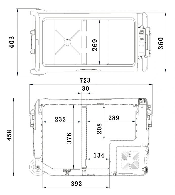 Wnętrze skrzynki jest podzielone na dwie części z możliwością różnych ustawień temperatury lub można usunąć ścianę działową i wykorzystać całą przestrzeń jako jedną. Umożliwia to dystrybucję żywności i napojów zgodnie z optymalnymi wymaganiami dotyczącymi chłodzenia. Wnętrze skrzynki jest dodatkowo wyposażone w oświetlenie LED. Uchwyty na zewnątrz wytrzymałego plastikowego pudełka wraz z gumowymi kółkami zapewniają doskonałą mobilność urządzenia.