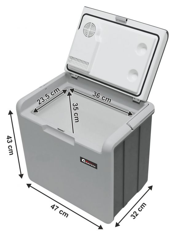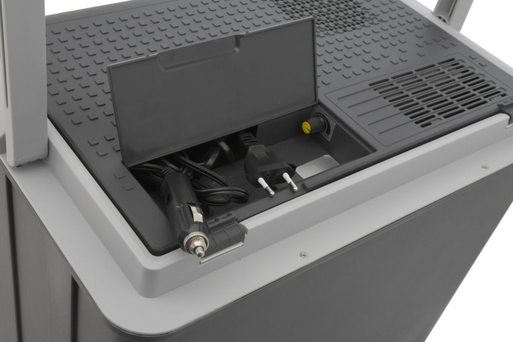 Przenośny box chłodzący, zasilany z gniazda zapalniczki samochodowej 12 V lub z gniazda 230 V. Idealny towarzysz w podróży, na wakacjach, na pikniku, a nawet na zakupach. Wewnętrzna pojemność 30 litrów może pomieścić dużą ilość jedzenia. Dzięki zagłębieniu w pokrywie można wygodnie umieścić w chłodziarce nawet wysokie butelki z napojami. Box jest bardzo łatwy do przenoszenia, wyposażony w praktyczny uchwyt ułatwiający transport. Jest to chłodziarka oparta na termoelektrycznym systemie chłodzenia z wentylatorem, nie zawierającym freonów. Dzięki niemu temperatura wewnątrz może być o 15 - 20°C niższa od temperatury otoczenia (przy 25°C). Po podłączeniu do gniazdka 230 V można ustawić pożądaną intensywność chłodzenia za pomocą pokrętła (sterowanie znajduje się w skrzynce kablowej), co pozwala znacznie zaoszczędzić zużycie energii.