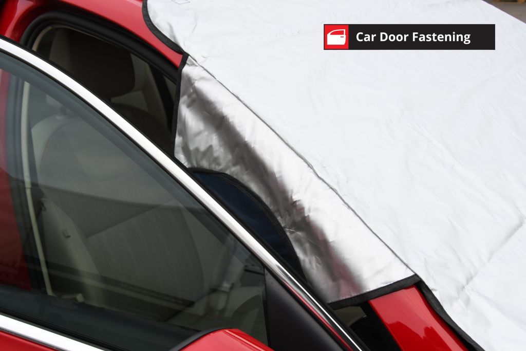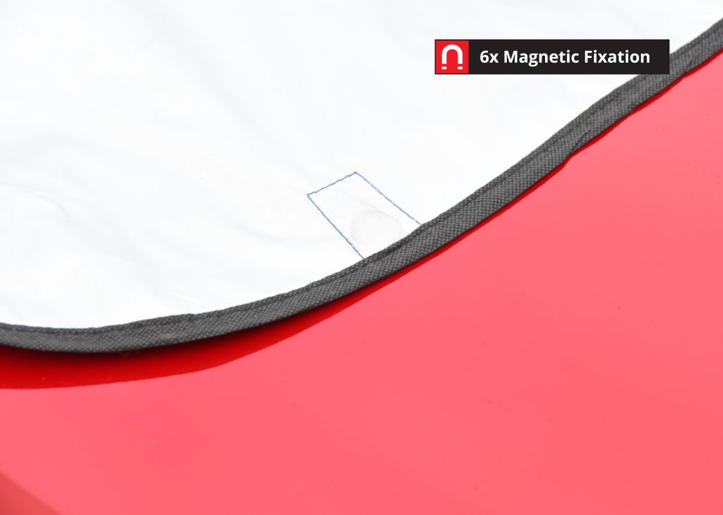 Ta praktyczna ochrona pozwala zaoszczędzić czas spędzony na skrobaniu lodu i ogrzewaniu w zimie. Ale może być również używana jako izolacja termiczna w gorące letnie dni, kiedy zapobiega nadmiernemu nagrzewaniu się i blaknięciu wnętrza z powodu promieniowania UV. Dwuwarstwowa konstrukcja osłony sprawia, że jej wymiary obejmują całą przednią szybę wraz z wycieraczkami. Produkt jest bardzo łatwy i szybki w montażu. Wystarczy umieścić go na przedniej szybie i przymocować, mocując uszy po bokach do drzwi. Krawędź osłony jest również wyposażona w wszyte magnesy, które mocno mocują osłonę do karoserii samochodu.