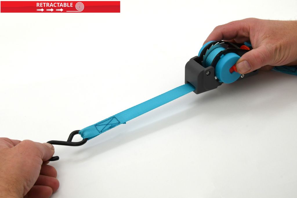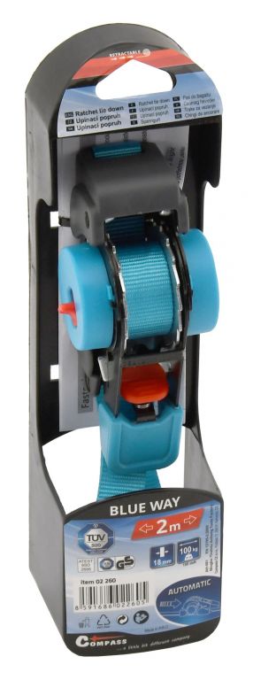 Samonawijający się pasek mocujący do zabezpieczania przedmiotów, bagażu lub ładunku. Do zaciskania służy całkowicie metalowa grzechotka z mechanizmem blokującym. Dodatkowo grzechotka wyposażona jest w mechanizm samozwijający, gdy pasek jest zwijany na całej swojej długości po naciśnięciu przycisku. Końce pasków wyposażone są w metalowe haczyki z utwardzoną powierzchnią z tworzywa sztucznego.