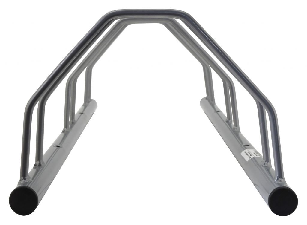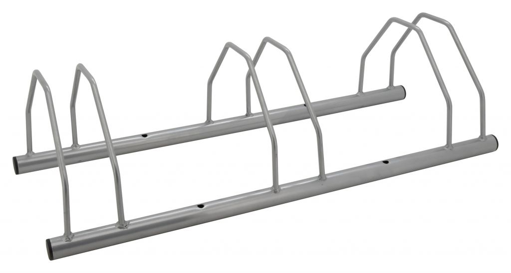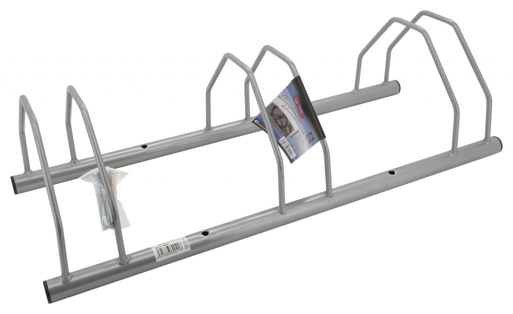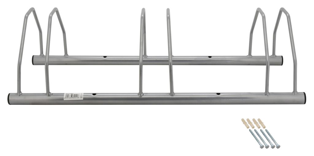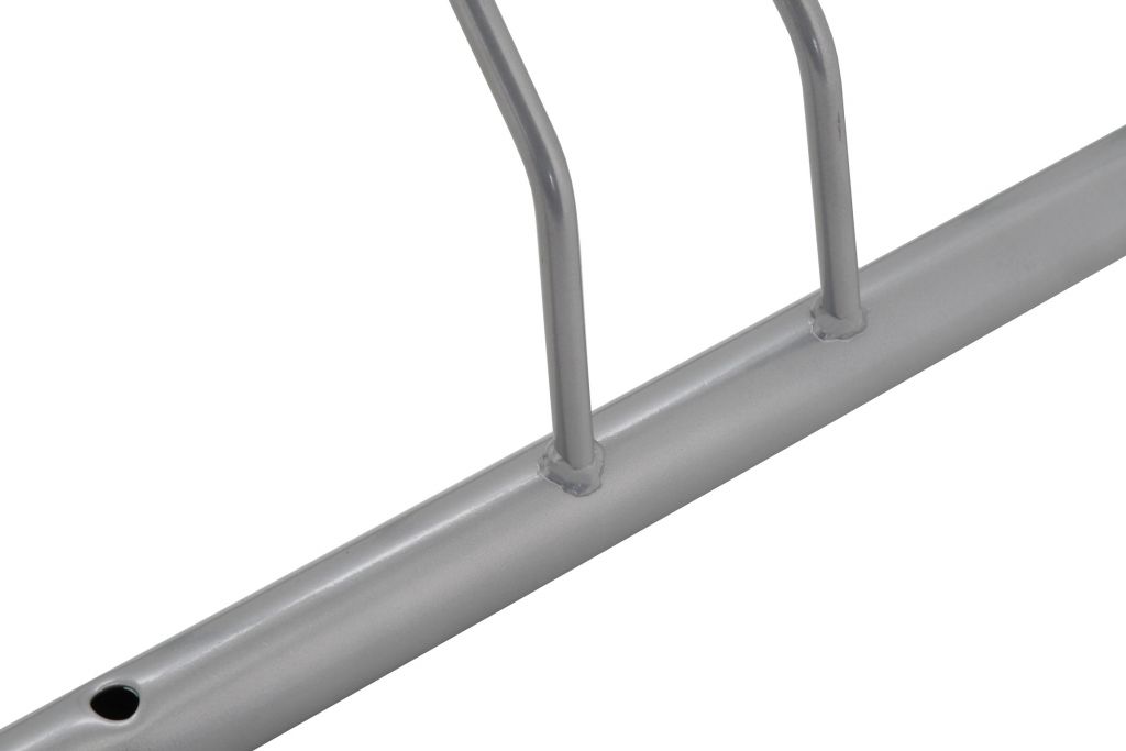 Praktyczny stojak na 3 rowery. Możesz go wykorzystać przed domem, w restauracji lub sklepie. W całości metalowa konstrukcja o szarosrebrnym wykończeniu wyposażona jest w drut o średnicy 9 mm (część górna) oraz rurki o średnicy 30 mm (część dolna), dzięki czemu zapewnia bezpieczne ustawienie rowerów. Stojak należy przymocować do podłoża za pomocą śrub z kołkami (w zestawie).