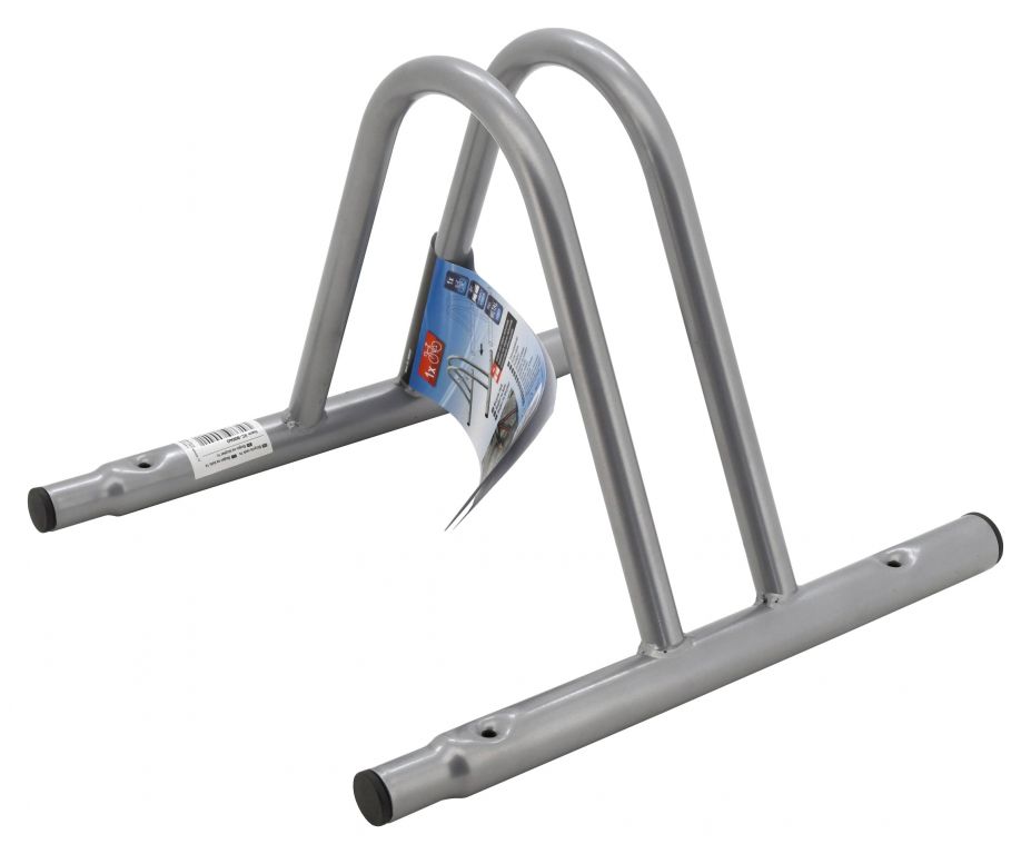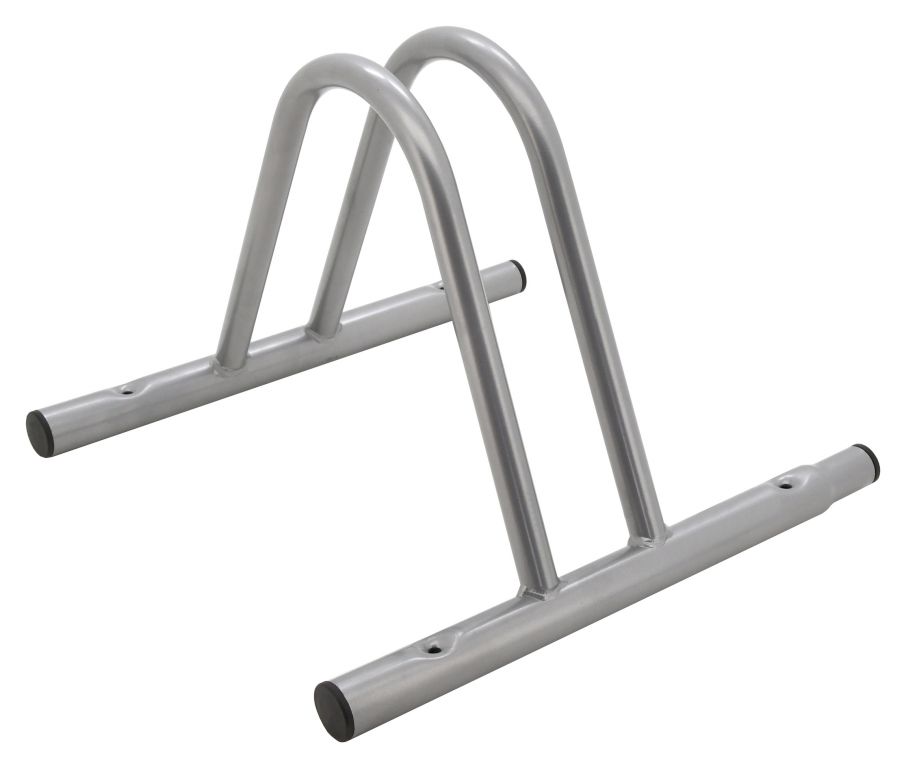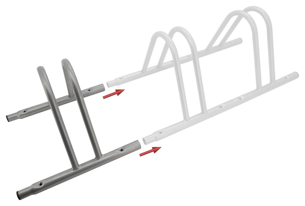 Całkowicie metalowa konstrukcja z szaro-srebrnym wykończeniem jest wyposażona w rurki o średnicy 20 mm (górna) i 30 mm (dolna), aby zapewnić bezpieczne pozycjonowanie kół. Dzięki stożkowemu zakończeniu możliwe jest połączenie wielu stojaków razem poprzez ich proste włożenie, co pozwala na dłuższe użytkowanie dla większej liczby rowerów. Stojak można przymocować do podłoża za pomocą śrub (brak w zestawie).