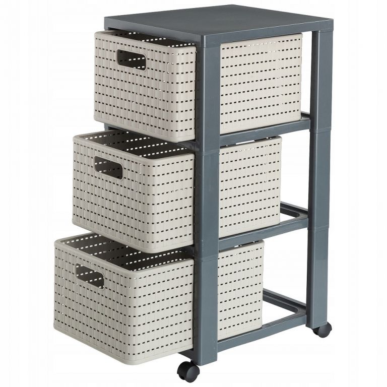 Półka plastikowa z trzema piętrami. Trzy pudełka do przechowywania, które wyglądem imitują rattan. Objętość pudełka to 18L. Koła dla łatwiejszej obsługi. Nowoczesny i wysokiej jakości design.