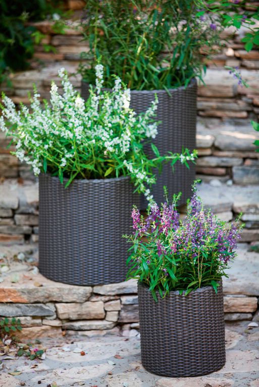 Plastikowa doniczka z imitacji rattanu, odpowiednia zarówno na zewnątrz, jak i do wnętrza.