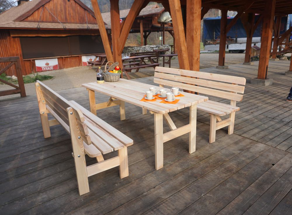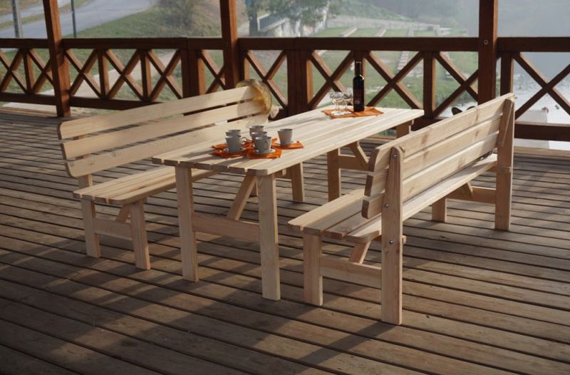 Stół ogrodowy z litego drewna sosnowego w kolorze naturalnym (nieobrobiony powierzchniowo - brak inpregnacji). Jakość wykonania i certyfikat FSC gwarantują długą żywotność Można kupić ławki Viking i stworzyć bardzo ładny zestaw ogrodowy.
