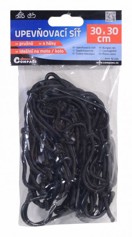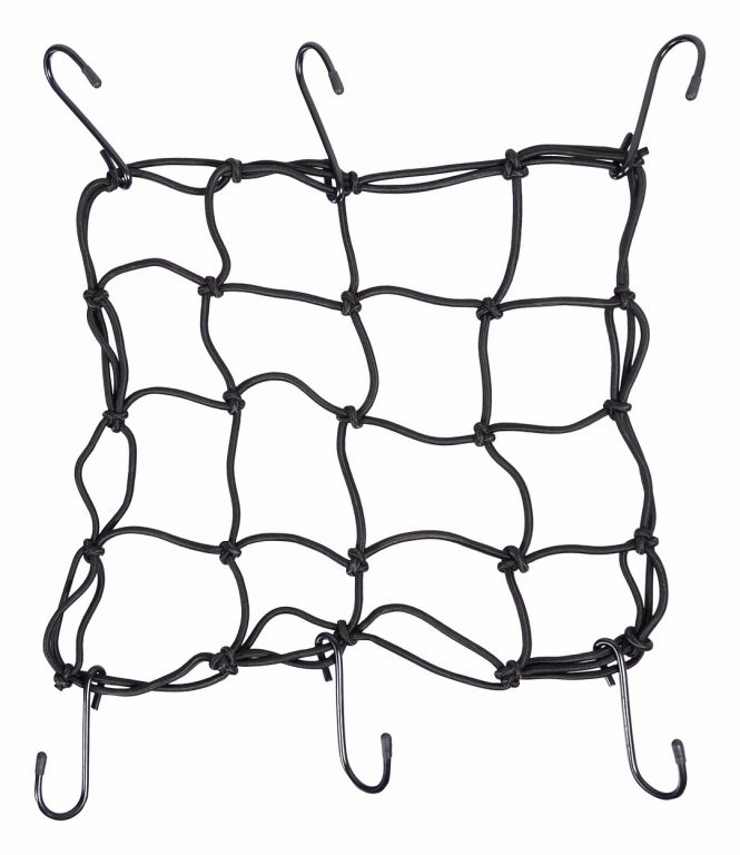Elastyczna siatka do mocowania o wymiarach 30 x 30 cm, wyposażona w haczyki ułatwiające zapinanie. Nadaje się do każdego środka transportu.