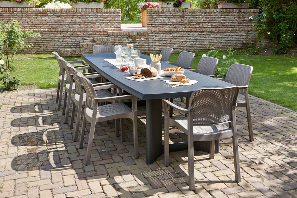 Fotel ogrodowy z tworzywa sztucznego w kolorze antracytowym. Nowoczesny design, łatwa konserwacja, wysoka wytrzymałość.