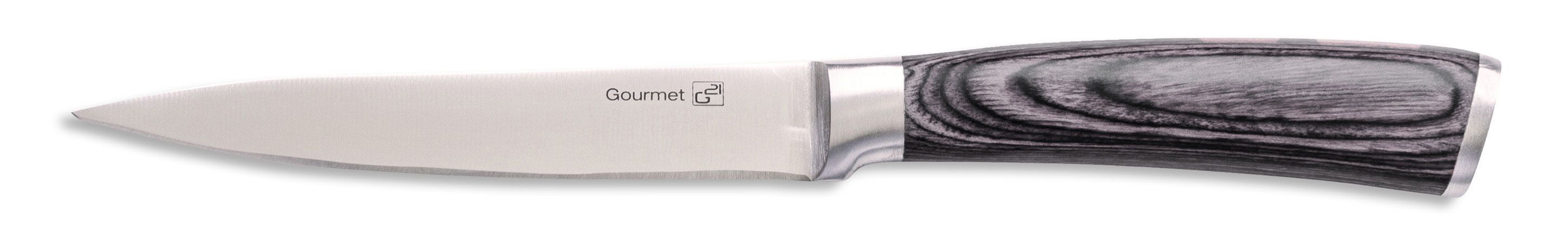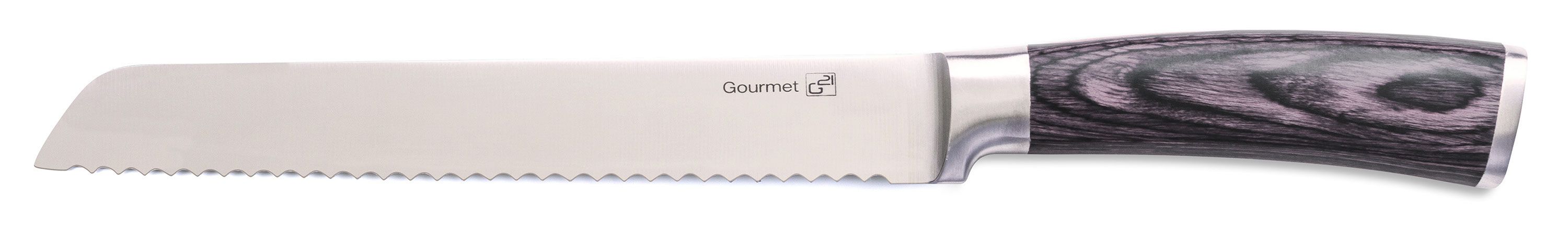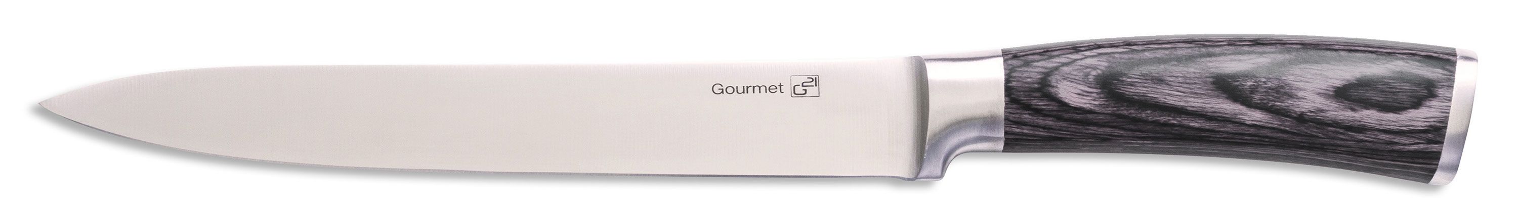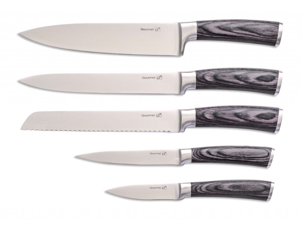W zestawie noży Gourmet Rustic znajdziesz nóż szefa kuchni 21 cm, nóż do krojenia 21 cm, nóż do chleba 21 cm, nóż uniwersalny 13 cm i nóż do krojenia 9 cm. Wszystkie 5 noży wykonanych jest z wysokiej jakości stali, która jest również używana do produkcji noży myśliwskich. Dzięki zastosowanemu materiałowi ostrze jest ostre, trwałe, mocne i posłuży przez wiele lat. Jednak właściwa pielęgnacja noży kuchennych jeszcze bardziej wydłuży ich żywotność i ostrość ostrzy. Podstawą jest odpowiednie przechowywanie - najlepiej w stojaku na nóż, który jest wykonany z bardzo wytrzymałego drewna bambusowego z elegancką czarną metalową listwą z przodu stojaka na nóż. Uchwyty wykonane są z bardzo mocnego, trwałego materiału, przy produkcji którego fornir z drewna liściastego impregnowany jest żywicą utwardzaną na gorąco. Efektem są solidne uchwyty, które nie ulegają zniszczeniu. Gładkie, proste, czyste linie tych noży staną się ozdobą każdej kuchni.