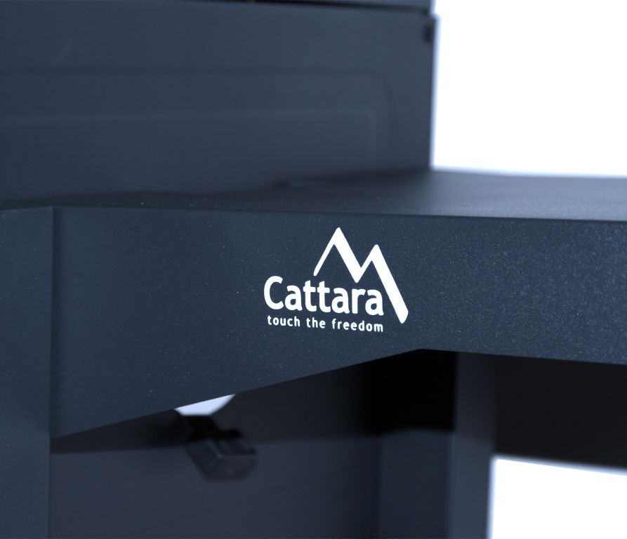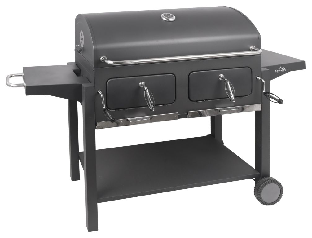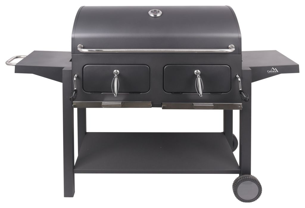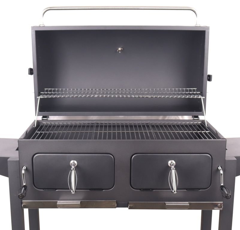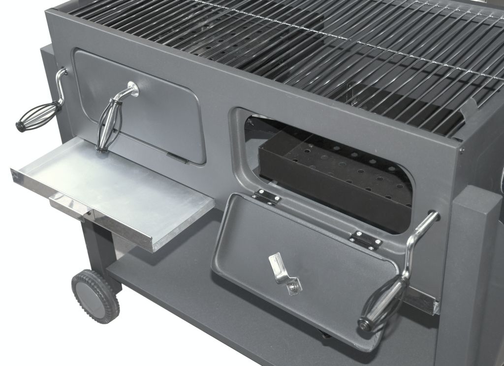 Bardzo stabilna konstrukcja wykonana z precyzyjnie obrobionej stali o trwałym, szorstkim czarnym kolorze. Konstrukcję uzupełniają 2 kółka ułatwiające mobilność grilla. Rama na dole służy do dalszego zwiększenia stabilności, a także jako miejsce do przechowywania. Po bokach znajdują się składane półki do przechowywania różnego sprzętu do grillowania lub przechowywania samych naczyń. Metalowe elementy sterujące i uchwyty są wystarczająco duże, aby zapewnić wygodny chwyt i łatwość w obsłudze. Dwustronna stalowa regulacja wentylacji idealnie komponuje się z konstrukcją. Pokrywa na zawiasach jest wyposażona w termometr w górnej części do stałej kontroli temperatury wewnątrz grilla. Do przygotowania potraw na ciepło grill jest wyposażony w solidny, trzyczęściowy ruszt stalowy. Ponadto strefa grillowa wyposażona jest w regał do przechowywania dań gotowych do utrzymywania temperatury lub ich podgrzania. Kolejną zaletą grilla są ruszty na węgiel o regulowanej wysokości, dzięki czemu przestrzeń do grillowania można regulować za pomocą mechanizmów z przodu, zgodnie z wymaganiami potraw. Drzwiczki z przodu grilla znacznie ułatwiają uzupełnianie węgla. Szuflady na popiół w najniższej części obszaru grilla są wtedy zapewnione dla łatwiejszego czyszczenia.