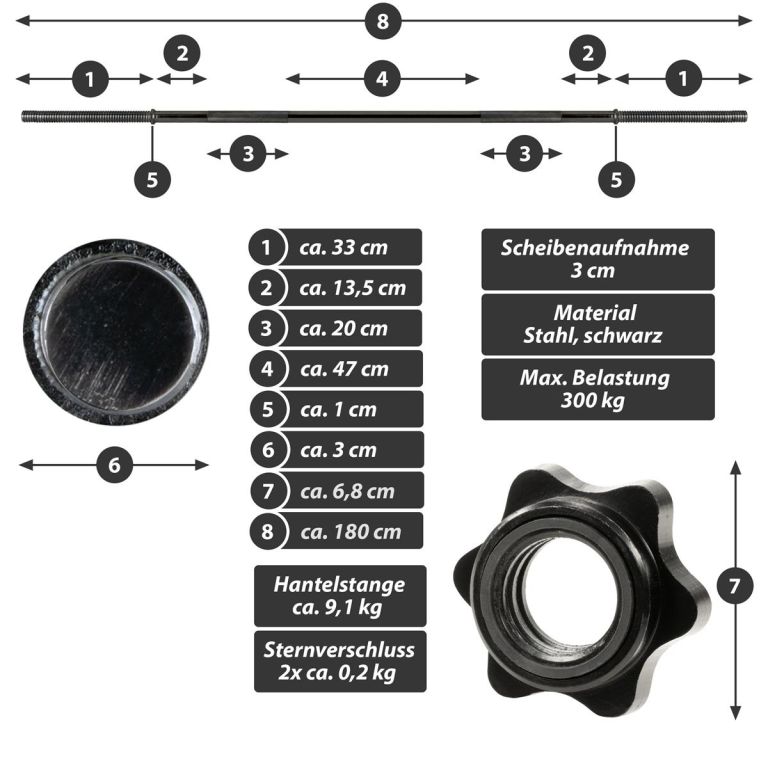 Optymalna hantla do użytku na siłowni i w domu, odpowiednia do treningu klatki piersiowej, ramion, barków, szyi, treningu siłowego, sportów rehabilitacyjnych, kulturystyki, wyciskania na ławce, martwego ciągu, przysiadów, wykroków, pompek itp. Hantla MAXXIVA® nadaje się do wszystkich dostępnych na rynku talerzy obciążnikowych z 3 cm uchwytem na talerz - średnica otworu 30/31 mm. Antypoślizgowy talerz jest przymocowany za pomocą pierścienia zabezpieczającego, aby zapobiec ześlizgiwaniu się ciężarków podczas ruchu. Blokady gwiazdkowe, które można szybko wymienić, bezpiecznie mocują obciążniki do drążka hantli i gwarantują łatwą wymianę obciążników. Poprzecznie rowkowane uchwyty na drążku trapezowym umożliwiają pewny chwyt drążka. Zwróć również uwagę na nasze inne artykuły fitness, takie jak hantle, drążki do podciągania, kajdanki, piłki do ćwiczeń, maty, deski do balansowania, steppery i wiele innych, aby skompletować swoją domową siłownię.