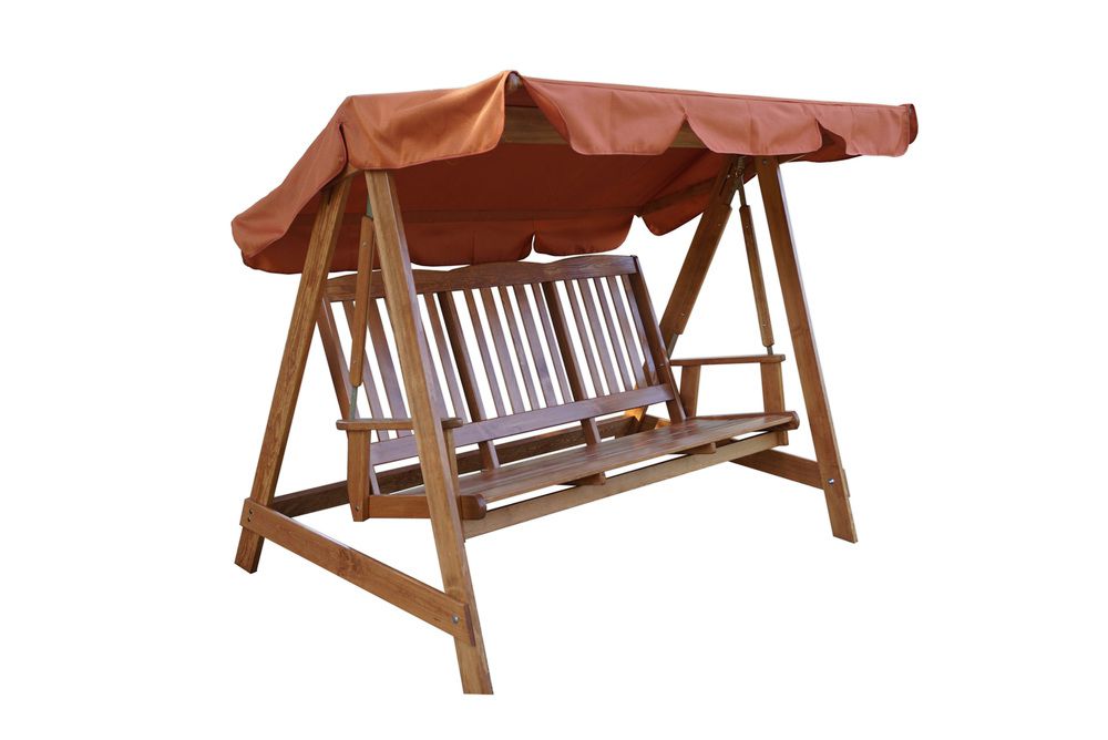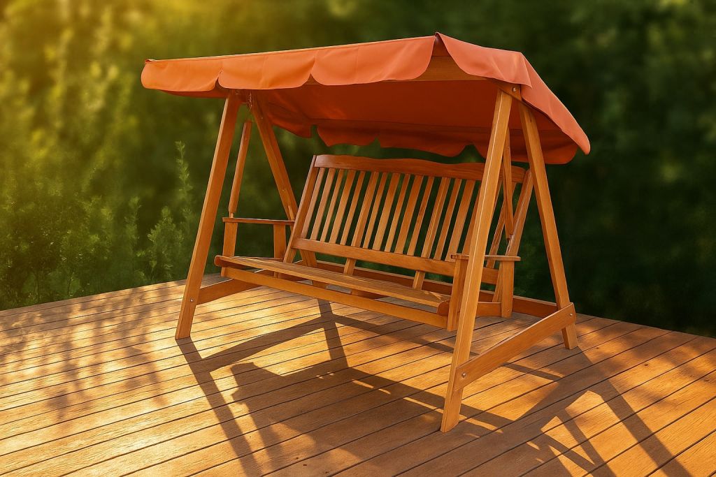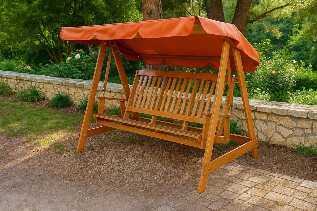 Odpoczywaj z rodziną na pięknej huśtawce z drewna. Wygodna, solidna, a dzięki pomarańczowemu daszkowi zawsze zapewnia przyjemny cień – ozdoba Twojego