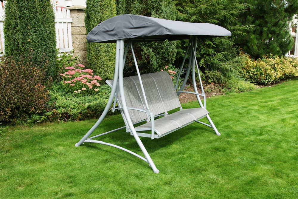 Ta huśtawka ogrodowa ma atrakcyjny nowoczesny design i jest idealna do ogrodu lub na taras. Konstrukcja jest metalowa, tkanina poliestrowa, siedzenie-textilen. Zaletą jest praktyczny daszek, przechylający się na dachu, który służy jako abażur.