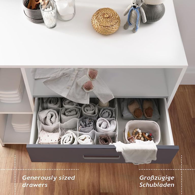 Przewijanie na dużej powierzchni do przewijania i posiadanie pieluszek, ubranek, produktów do pielęgnacji niemowląt i innych rzeczy w zasięgu ręki zapewni komfort Tobie i Twojemu dziecku. Biały kolor tego mebla dziecięcego z łatwością pasuje do różnych stylów wnętrz. Gdy dziecko wyrośnie z przewijaka, można łatwo zdemontować przewijak z tego wielofunkcyjnego mebla na stałe. W ten sposób komoda może być nadal używana i rosnąć wraz z rozwojem malucha.