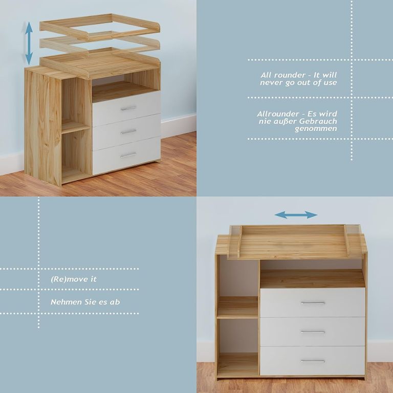 Przewijanie na dużej powierzchni do przewijania i posiadanie pieluszek, ubranek, produktów do pielęgnacji niemowląt i innych rzeczy w zasięgu ręki zapewni komfort Tobie i Twojemu dziecku. Biały kolor tego mebla dziecięcego z łatwością pasuje do różnych stylów wnętrz. Gdy dziecko wyrośnie z przewijaka, można łatwo zdemontować przewijak z tego wielofunkcyjnego mebla na stałe. W ten sposób komoda może być nadal używana i rosnąć wraz z rozwojem malucha.