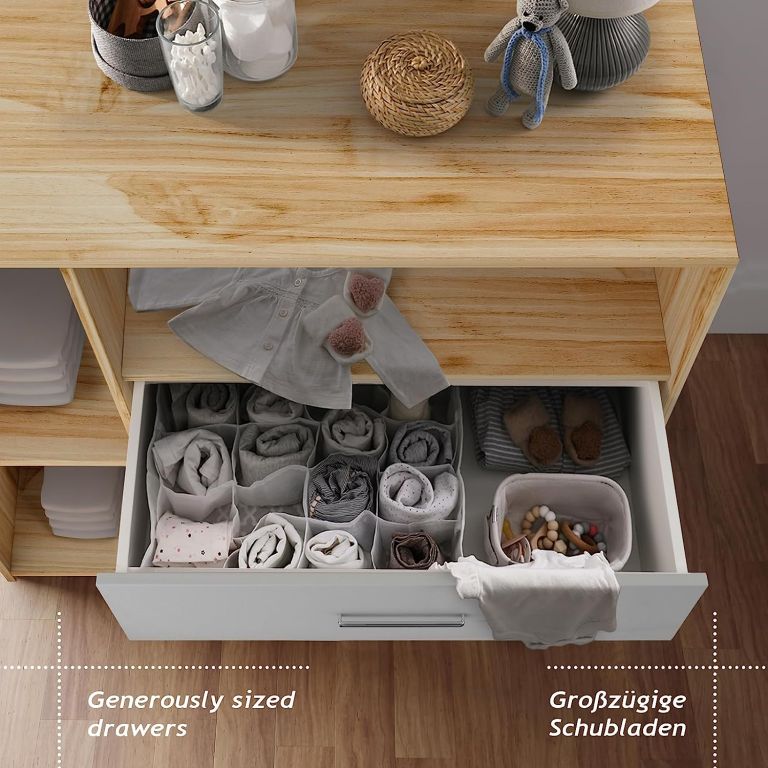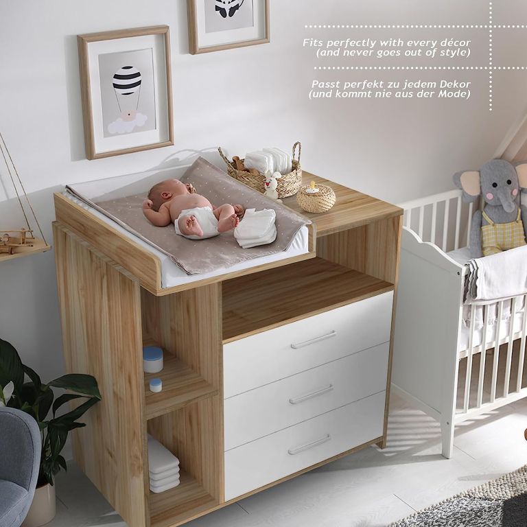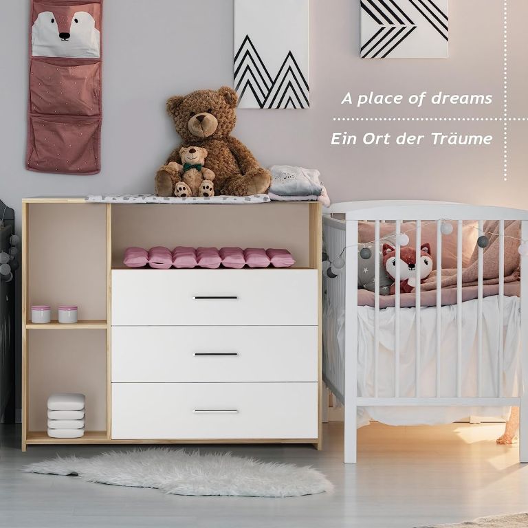 Nasza komoda do przewijania z dużą ilością miejsca do przechowywania w trzech szufladach i trzema otwartymi półkami jest idealnym dodatkiem do pokoju