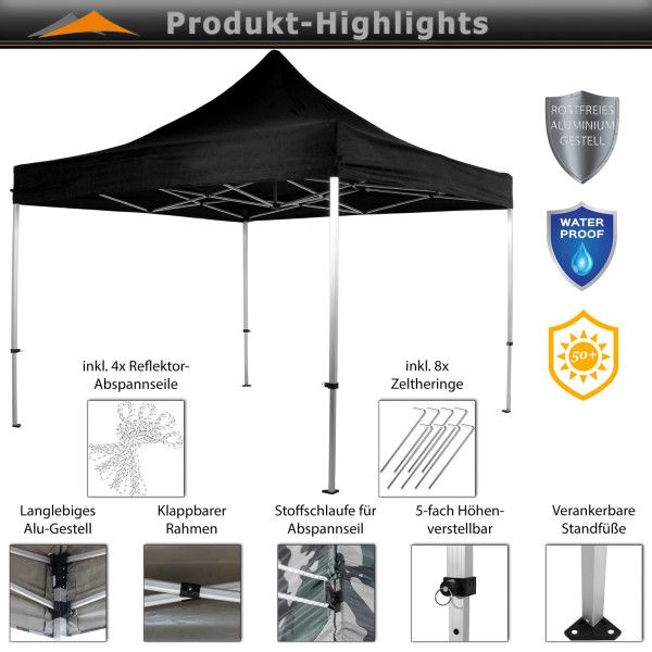 Profesjonalny składany namiot o konstrukcji nożycowej, dzięki któremu można łatwo i szybko ustawić i złożyć namiot. Namiot zapewnia wystarczającą ilość cienia w upalne dni, chroni przed wieczornymi przeciągami, a także może służyć jako ochrona przed lekkim wiatrem i deszczem. Namiot nie jest przeznaczony na niesprzyjające warunki pogodowe, takie jak ulewne deszcze, wiatry i burze. Nigdy nie pozostawiaj namiotu bez nadzoru.