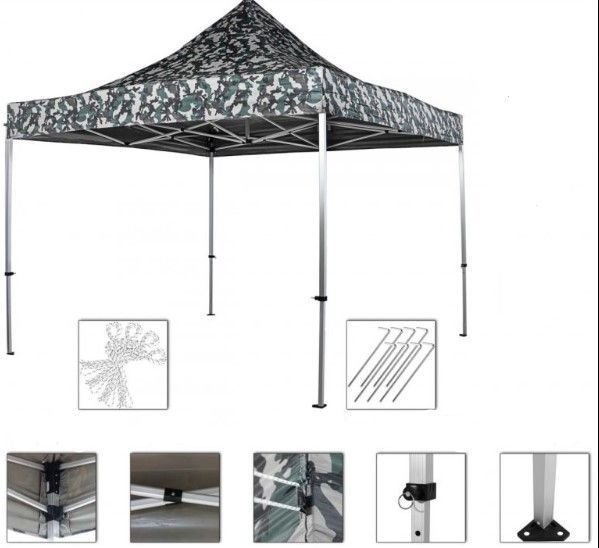 Namiot składany wykonany jest z wysokiej jakości materiału. Na pierwszy rzut oka zachwyca niepowtarzalnym designem i jakością użytego materiału. Namiot jest w 100% funkcjonalny. Jest wodoodporny, a dzięki specjalnie zaimpregnowanemu pokryciu dachowemu blokuje do 98% promieni słonecznych UV. Rama ze stali nierdzewnej zapewnia ochronę przed zarysowaniami i korozją. Dla dodatkowej stabilności i podparcia zastosowano powiększone nogi konstrukcji, materiał łączący z możliwością ekstrakcji oraz wysokiej jakości system klikalny z zabezpieczeniem zewnętrzną śrubą z pierścieniem napinającym. Środkowa kolumna napinająca jest zintegrowana ze wspornikiem dachu.