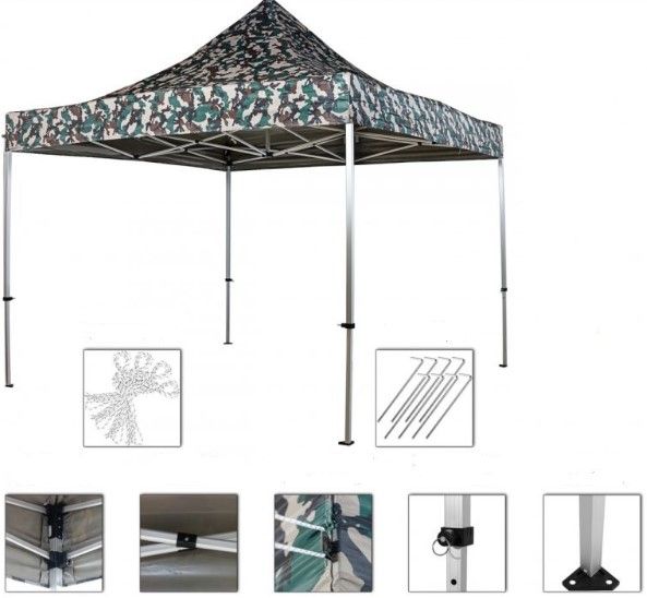 Namiot składany wykonany jest z wysokiej jakości materiału. Na pierwszy rzut oka zachwyca niepowtarzalnym designem i jakością użytego materiału. Namiot jest w 100% funkcjonalny. Jest wodoodporny, a dzięki specjalnie zaimpregnowanemu pokryciu dachowemu blokuje do 98% promieni słonecznych UV. Rama ze stali nierdzewnej zapewnia ochronę przed zarysowaniami i korozją. Dla dodatkowej stabilności i podparcia zastosowano powiększone nogi konstrukcji, materiał łączący z możliwością ekstrakcji oraz wysokiej jakości system klikalny z zabezpieczeniem zewnętrzną śrubą z kółkiem napinającym. Do podparcia dachu jest zintegrowana centralna kolumna napinająca.