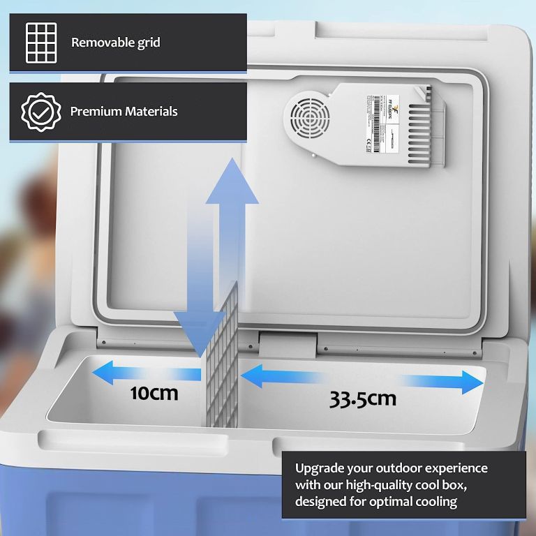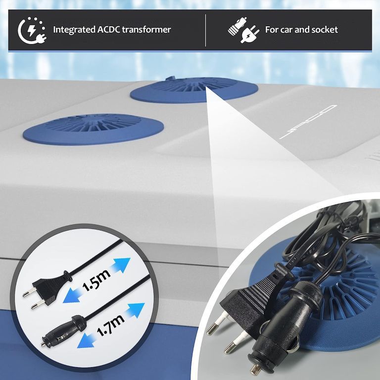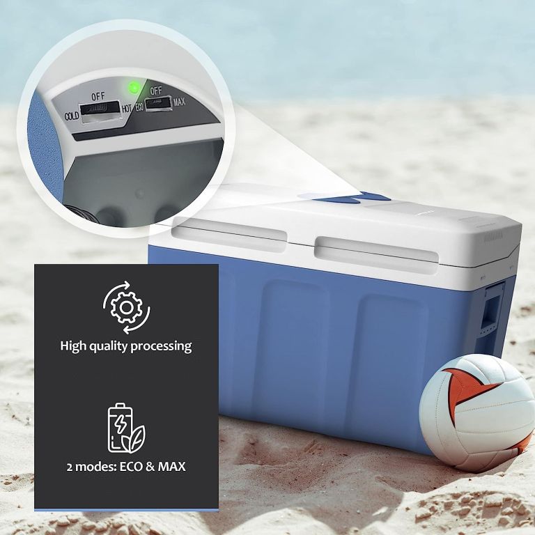 Pojemność chłodzacy wynosi 40 litrów, dzięki czemu można w niej przechowywać ciepłe lub zimne jedzenie i napoje na kempingu lub podczas wycieczek. Box ma wiele przyjaznych dla użytkownika funkcji, takich jak zintegrowany uchwyt, dwa różne połączenia zasilania (normalne i samochodowe) oraz dwukierunkowy system otwierania pokrywy. Jest wyposażony w program ECO, który zużywa mniej energii, a izolacja C5H10 utrzymuje stabilną temperaturę wewnątrz przez dłuższy czas. Wykonany jest z wysokiej jakości i wytrzymałych materiałów i wytrzyma zużycie na kempingu, plaży lub w ogrodzie. Przechowywać w temperaturze od 10 do 32 °C