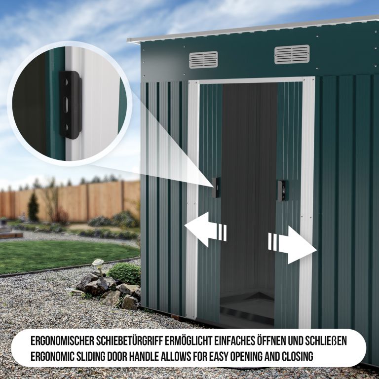 Witamy w naszym ogrodowym raju! Przedstawiamy niesamowity domek narzędziowy Jago®, niezawodnego partnera w perfekcyjnie zaaranżowanym ogrodzie! Ten domek to coś więcej niż tylko praktyczne schronienie dla narzędzi ogrodowych i artykułów gospodarstwa domowego. To stylowy klejnot, który doda Twojemu ogrodowi nieodpartego uroku. Dzięki kompaktowym wymiarom, które nie wpłyną na ogólny wygląd ogrodu, nadal zapewni mnóstwo miejsca do przechowywania wszystkich narzędzi. Dzięki praktycznej powierzchni z ocynowanej stali i odporności na warunki atmosferyczne, ta szopa ogrodowa poradzi sobie z każdym wyzwaniem rzuconym przez pogodę. Zapomnij o rdzewieniu i zmartwieniach związanych z konserwacją! Odporność na promieniowanie UV chroni ją przed blaknięciem i zapewnia, że cenne narzędzia pozostaną w idealnym stanie. Drzwi tej skrzynki narzędziowej są przesuwane, zapewniając łatwy dostęp i maksymalizując przestrzeń wewnątrz. Ponadto cztery kratki wentylacyjne zapewniają optymalną cyrkulację powietrza, co jest kluczem do utrzymania narzędzi w idealnym stanie. Montaż tej szopy ogrodowej jest szybki i łatwy. Dzięki jasnym instrukcjom i pomocy drugiej osoby można ją zbudować w ciągu 2-3 godzin. Możesz być pewien, że sobie poradzisz!