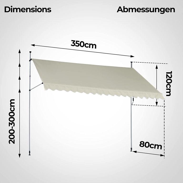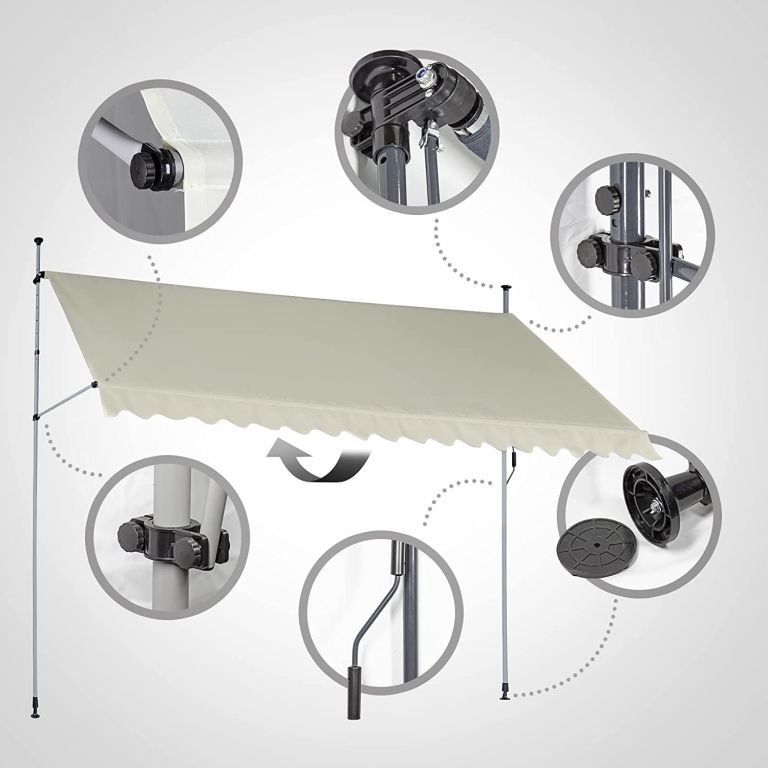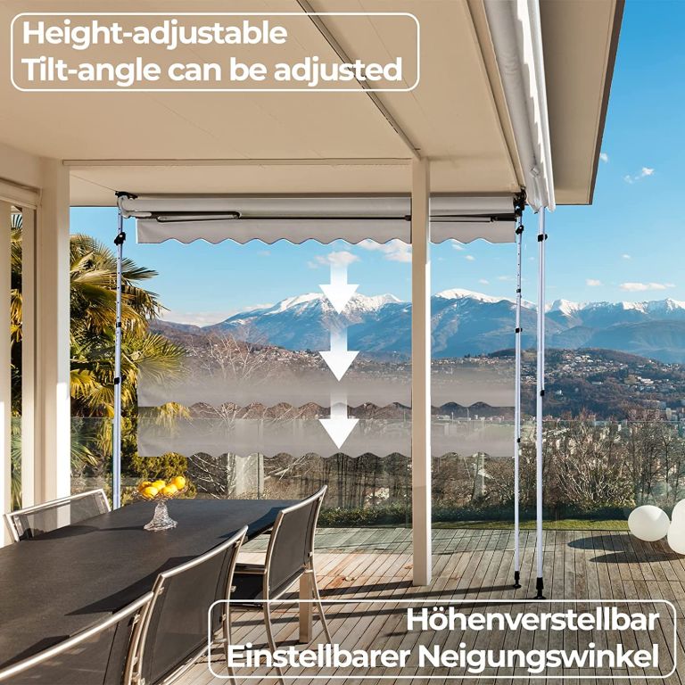 Markiza balkonowa jest w całości wykonana z wodoodpornego poliestru z warstwą poliuretanu ze zintegrowaną ochroną przed promieniowaniem UV. Wysokość markizy przeciwsłonecznej można regulować w zakresie od 2 do 3 m, dzięki czemu można dostosować markizę do potrzeb pomieszczenia. Ręcznie sterowaną markizę tarasową można indywidualnie regulować dzięki ręcznemu uchwytowi drążka teleskopowego, który reguluje kąt nachylenia. Dzięki praktycznemu zapięciu markiza zaciskowa jest gotowa do użytku w mgnieniu oka, bez potrzeby zbędnej ingerencji w Twoje pomieszczenie.