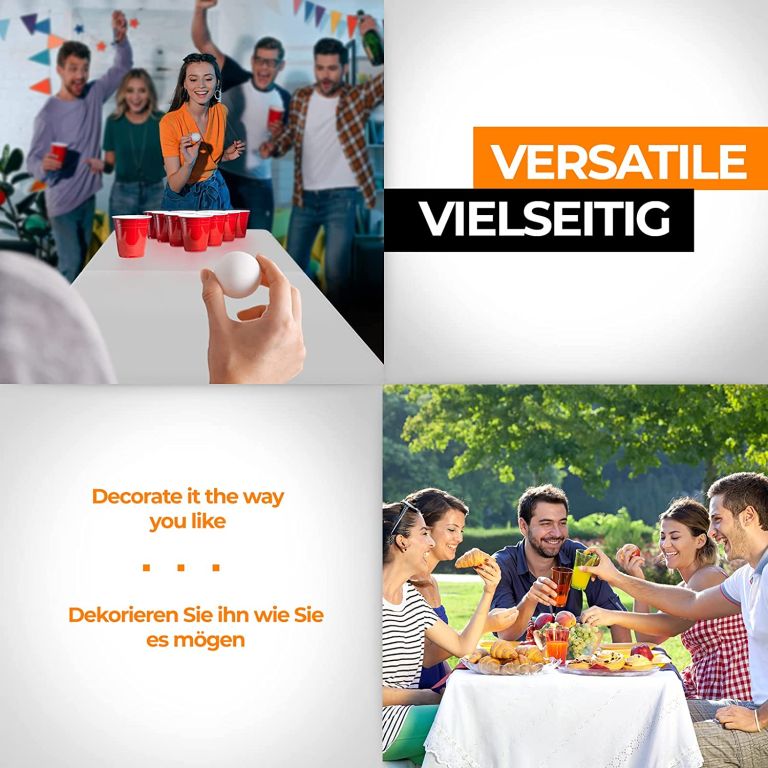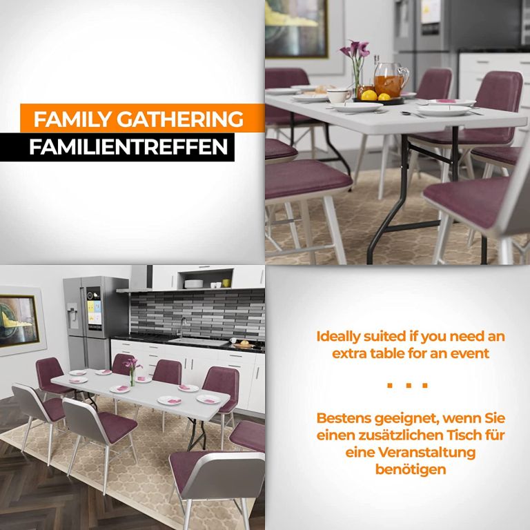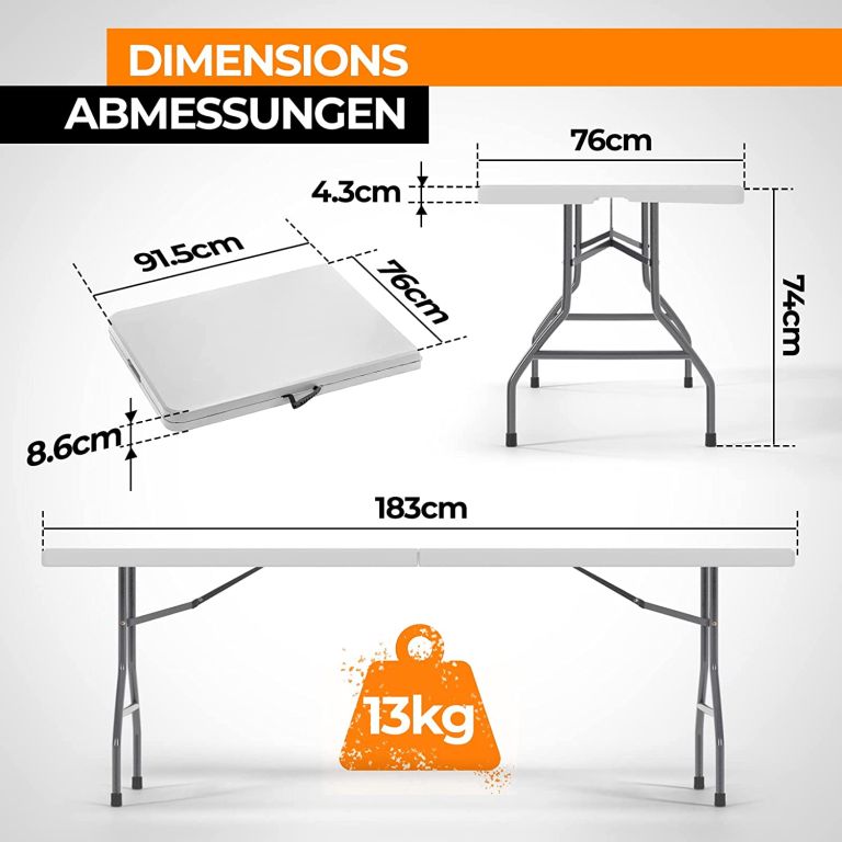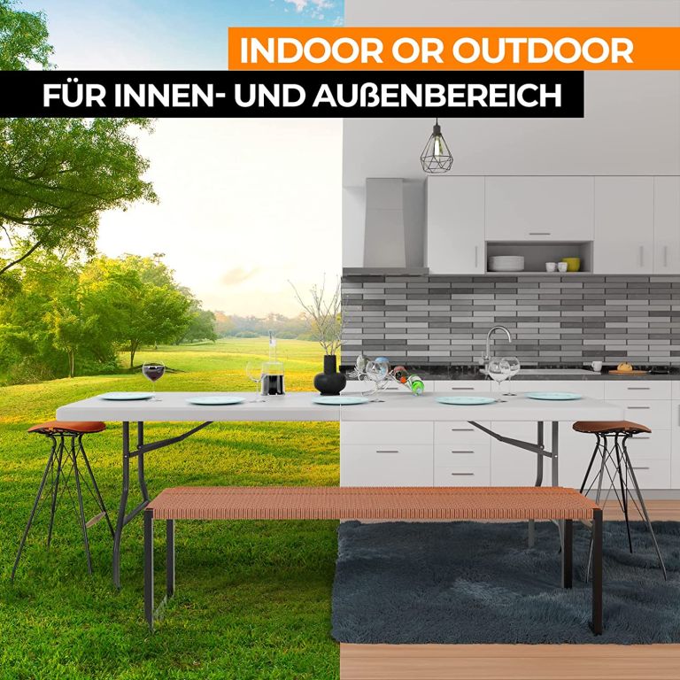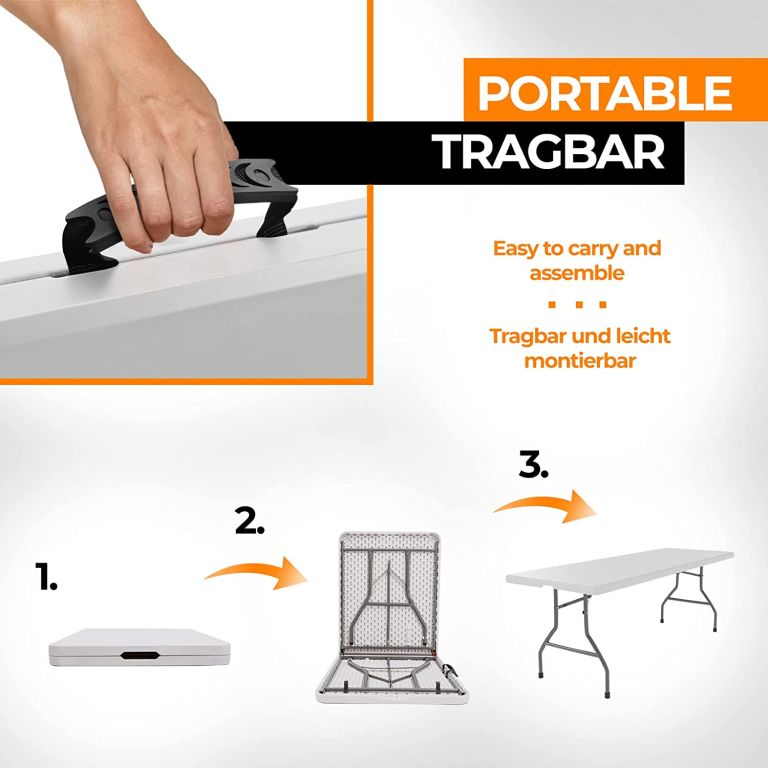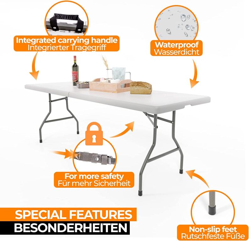 Ten wszechstronny składany stół jest idealny na przyjęcia w ogrodzie z przyjaciółmi, rodzinne obiady i przyjęcia urodzinowe dla dzieci. Dzięki swoim rozmiarom stół bufetowy może być używany zarówno na zewnątrz, jak i wewnątrz. Stół łatwo się składa, co ułatwia przechowywanie i transport dzięki zintegrowanemu uchwytowi i niewielkiej wadze. Solidne nogi z gumowymi nakładkami zapewniają stabilność. Solidne stalowe nogi oraz blat wykonany z odpornego na zarysowania tworzywa HDPE o maksymalnym obciążeniu 150 kg czynią ten stół trwałym meblem.