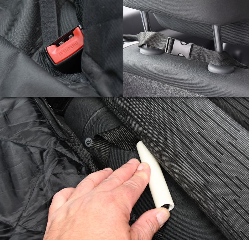 Pikowany, wielowarstwowy materiał zapewnia wygodne podróżowanie psa. Koc chroni również tylną stronę przednich siedzeń i boki siedzeń, dzięki uszom po bokach. Koc ma otwory na pasy bezpieczeństwa, zapinane na rzep. Mocowanie odbywa się za pomocą zagłówków z mocowaniem między siedzeniami.