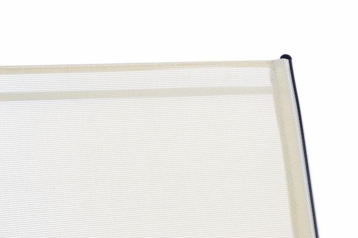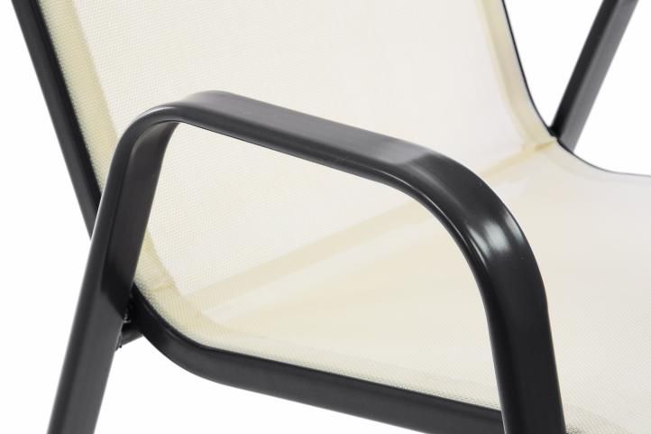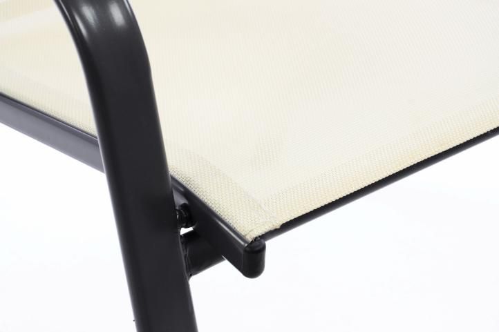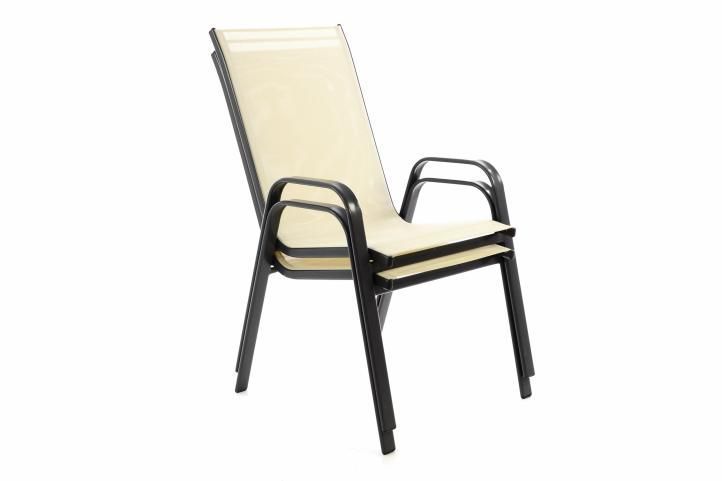 Wygodne krzesło do ustawiania w stosy, wykonane z wytrzymałej stali, jest idealne do użytku wewnątrz i na zewnątrz. Siedzisko i oparcie pokryte kremową elastyczną tkaniną. Kolor ramy to czarny.