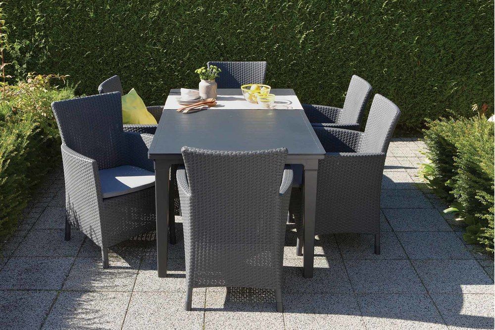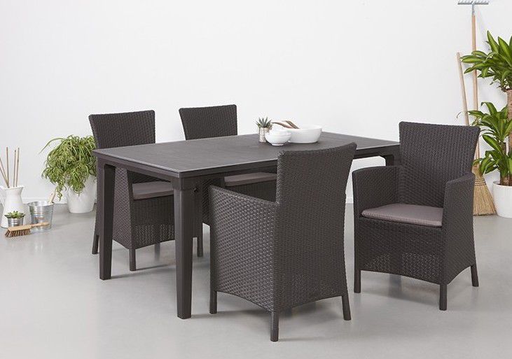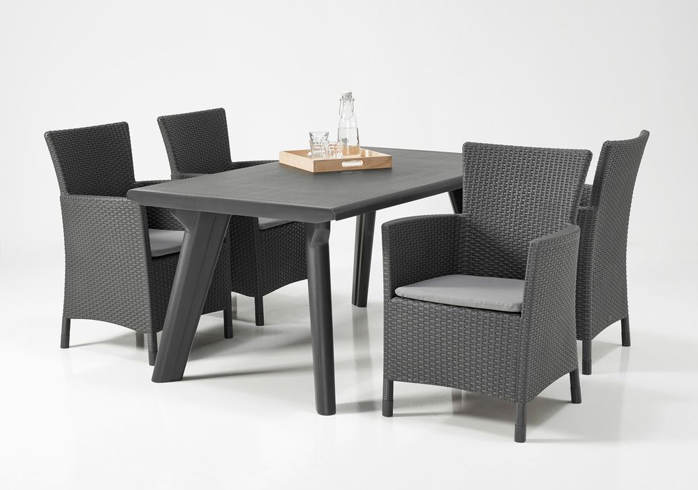 Całość wykonana została z najwyższej jakości polipropylenu o strukturze naturalnego rattanu. Zastosowanie tworzyw sztucznych pozwoliło uzyskać najlepszą odporność na warunki atmosferyczne i promieniowanie UV. Zestaw jest wyjątkowo trwały i może być pozostawiony na zewnątrz przez cały rok, ale może być używany i wewnątrz. Stanowi idealne wyposażenie domu.