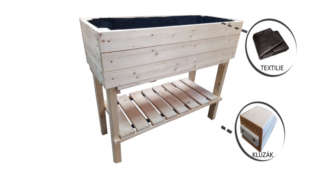 Dzięki temu kwietnikowi Twoja praca będzie łatwiejsza i bez przyjemnego schylania się i klękania. Wykonany jest z materiału o grubości 20 mm, a nogi mają grubość 40 x 60 mm. Półki do przechowywania narzędzi do uprawy i sadzenia. Geowłókniny są częścią opakowania. Doniczka od spodu posiada plastikową zatyczki dla lepszej stabilności i aby drewniane nogi nie stykały się z podłożem.