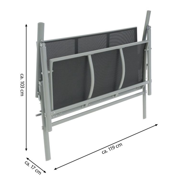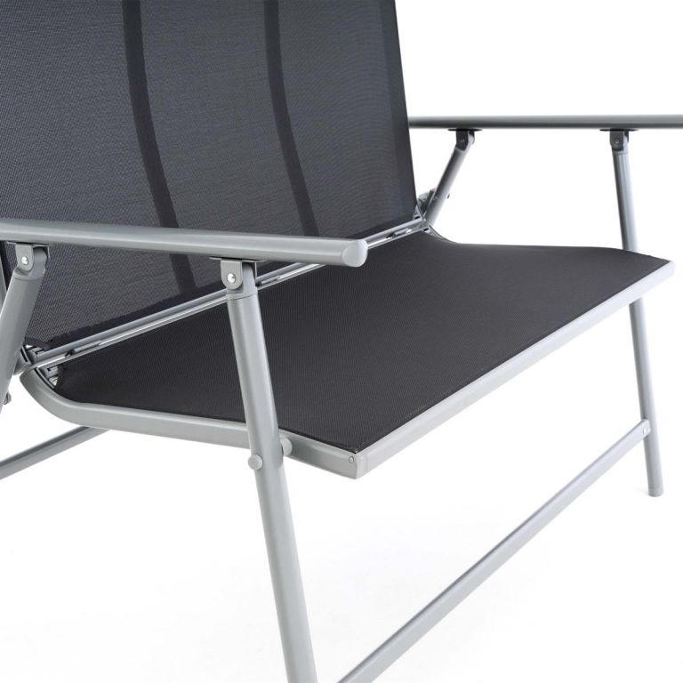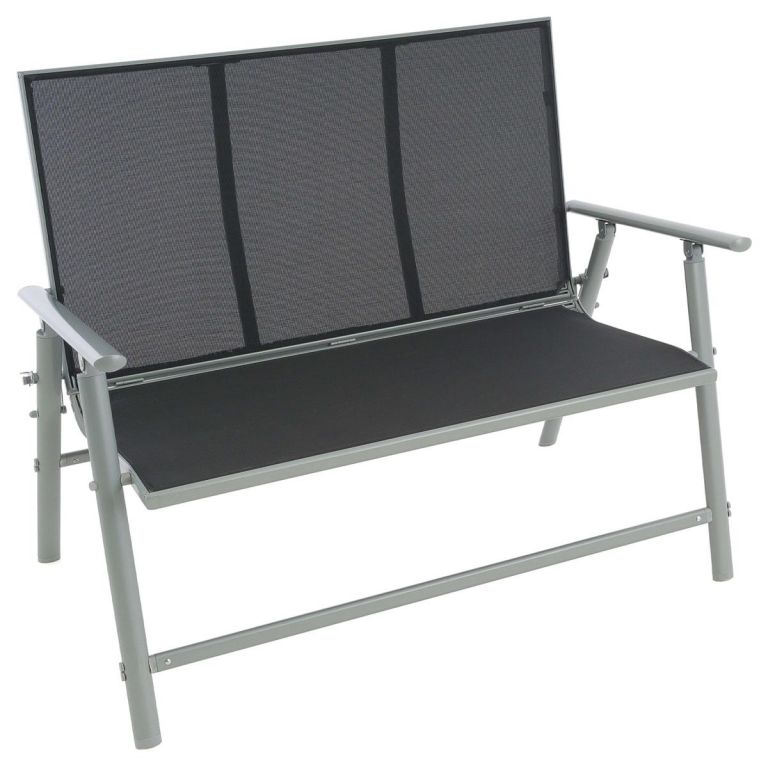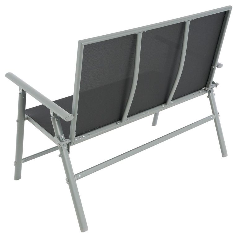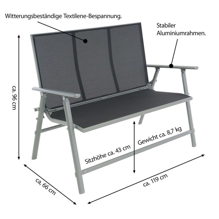 Ta piękna i stabilna ławka ogrodowa idealnie nadaje się na taras, werandę, balkon, oranżerię lub ogród. Lekka ławka ogrodowa o ponadczasowym designie, którą można oczywiście wykorzystać również jako ławkę balkonową lub na taras. Ławka składa się ze stabilnej aluminiowej ramy z czarną osłoną tekstylną 2x2. Ławka przeznaczona jest dla maksymalnie 2 osób, odporna na warunki atmosferyczne, solidna, stabilna i lekka. Dodatkowo powierzchnia jest bardzo łatwa w pielęgnacji i nie wymaga specjalnych środków pielęgnacyjnych. Montaż odbywa się błyskawicznie. Powierzchnia ze stali nierdzewnej dzięki aluminiowej ramie. Dzięki funkcji składania ławkę można przechowywać praktycznie w dowolnym miejscu.