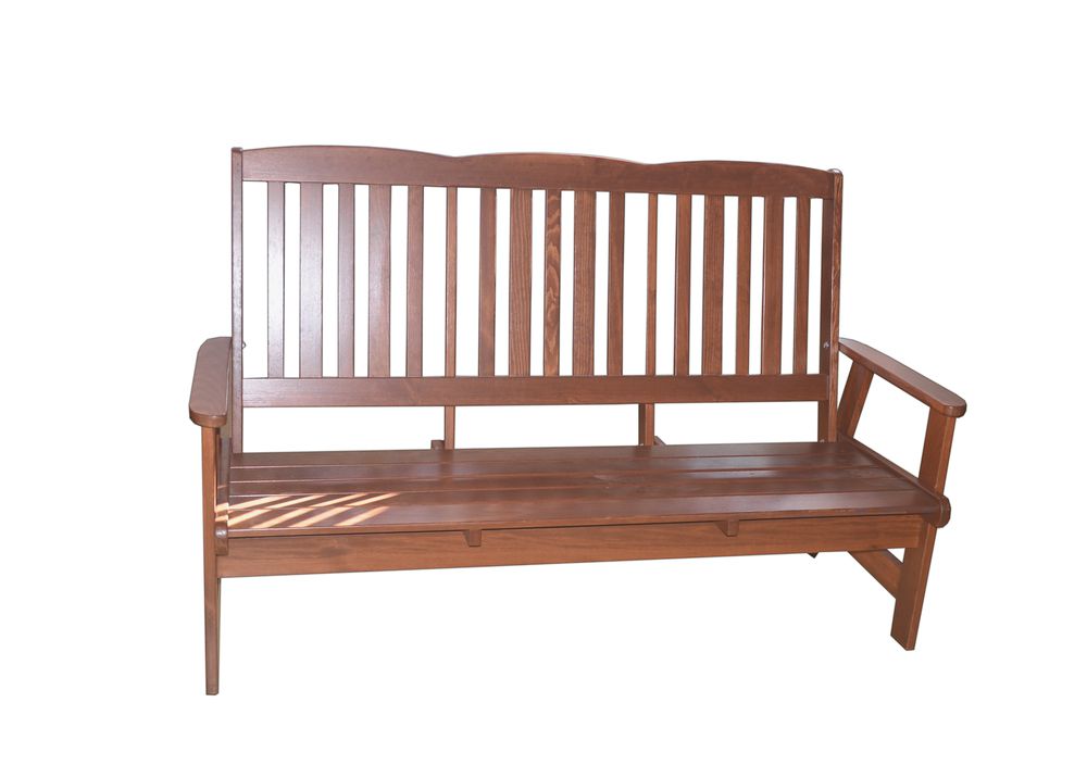 Drewniana ławka w kolorze brązowym - lakierowane drewno sosnowe.