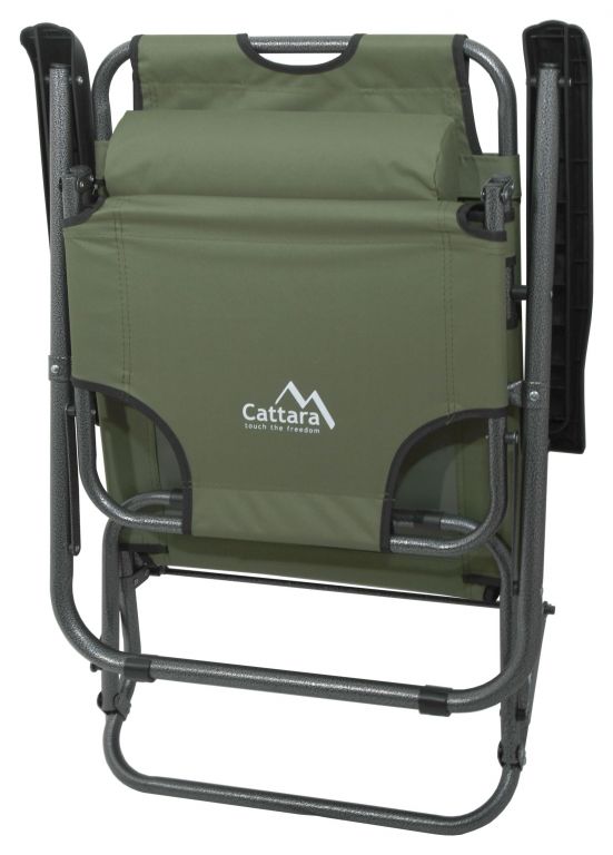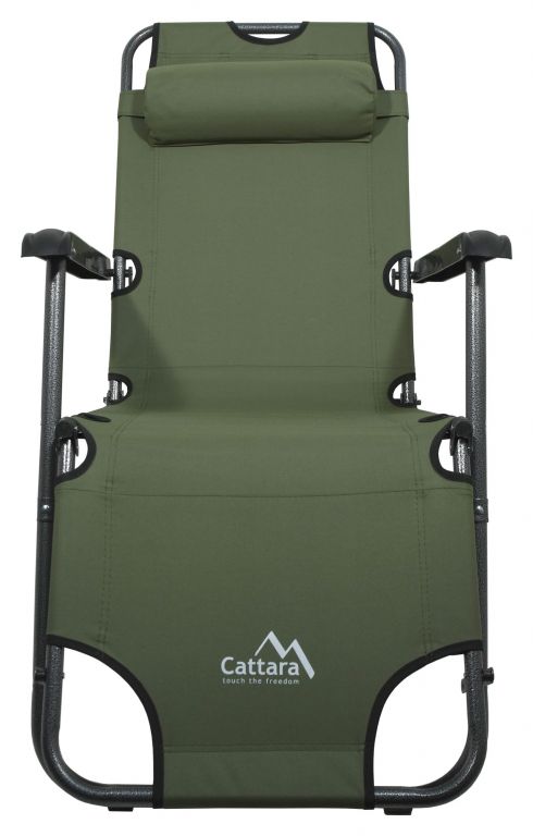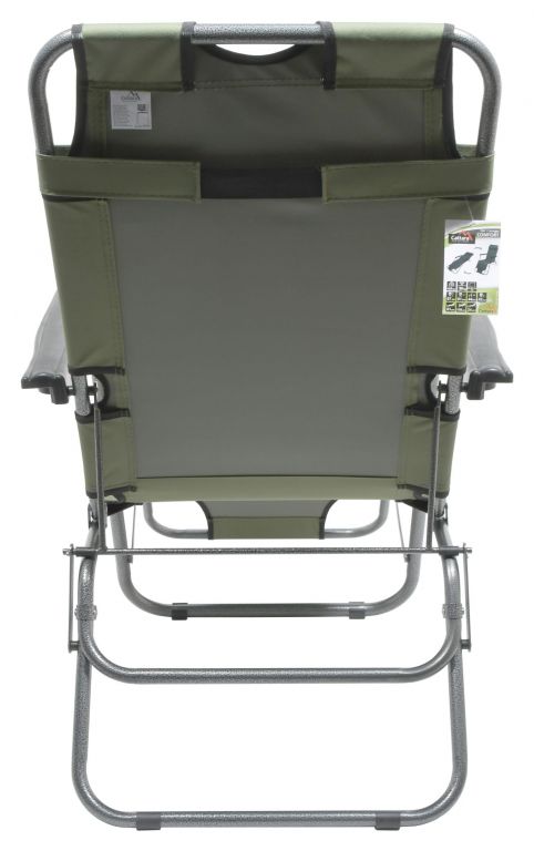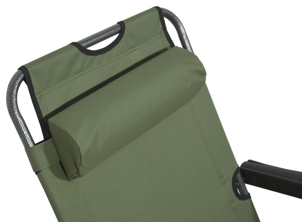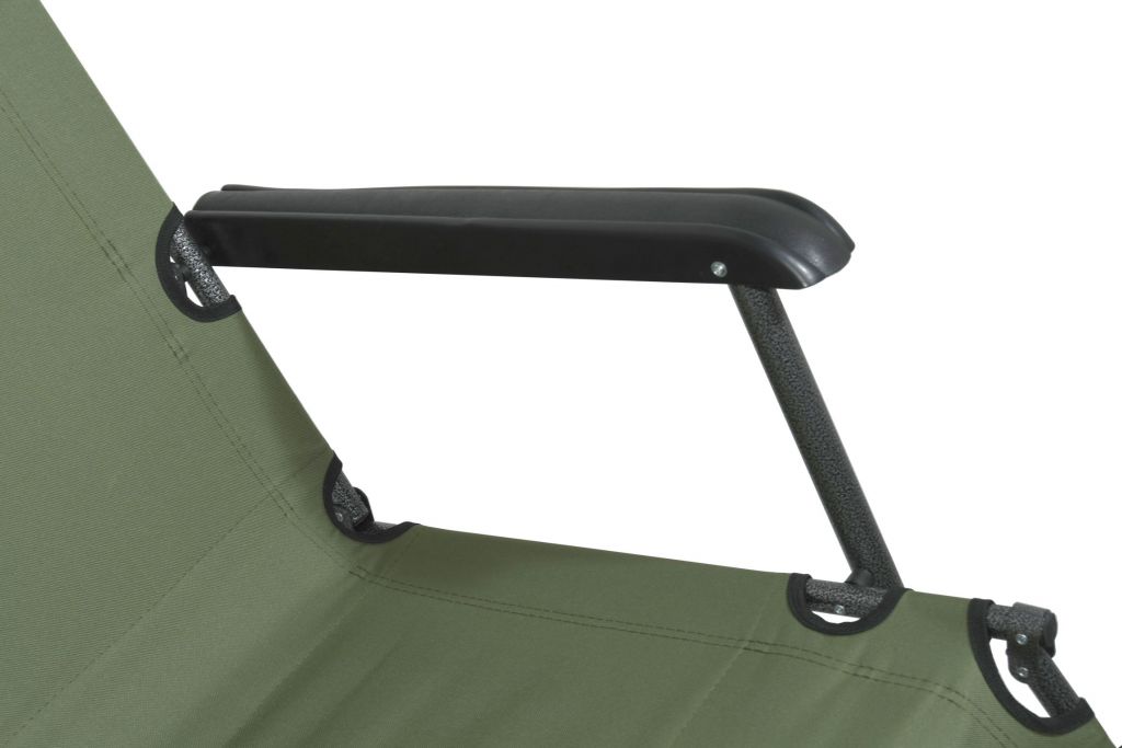 Leżak może być używany w tradycyjny sposób lub może zostać złożony na krześle wędkarskim, który doceni każdy entuzjasta outdooru. Łóżko jest wyposażone w poduszkę o regulowanej wysokości i podłokietniki dla maksymalnego komfortu.