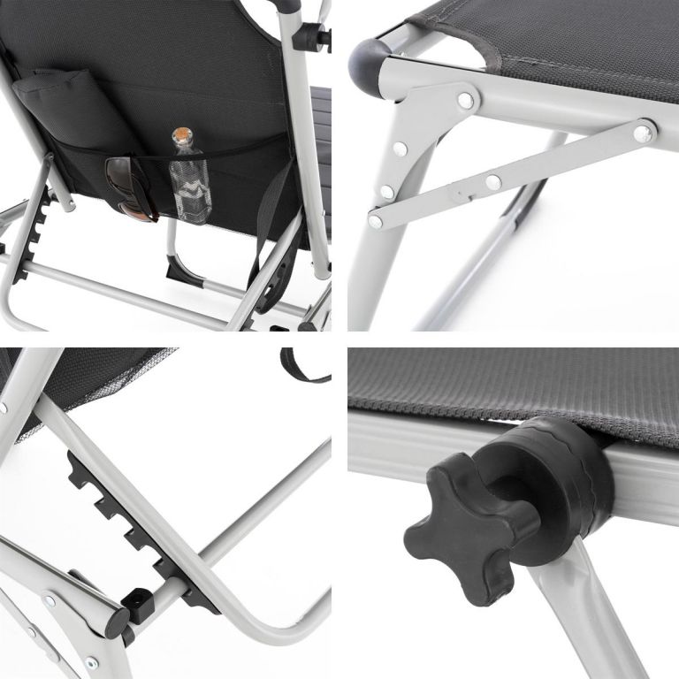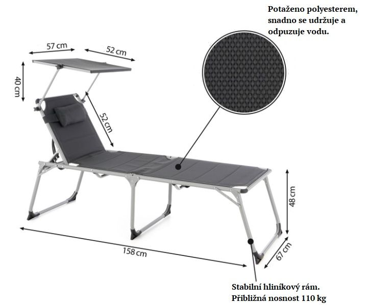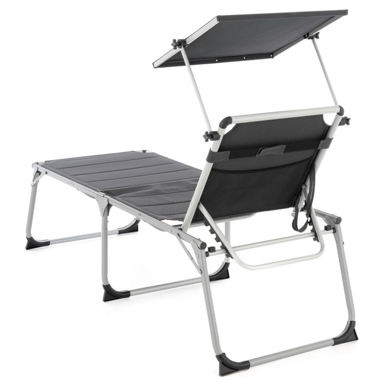 Leżak oferuje maksymalną elastyczność, jest praktyczne, wygodne, stabilne, solidne, odporne na warunki atmosferyczne, lekkie, trwałe i łatwe w obsłudze. Zwłaszcza w lecie często stosuje się go w ogrodzie, na tarasie, w basenie lub podczas biwakowania. Regulowany baldachim zapewnia przyjemny cień. Ponadto oparcie można regulować w sześciu pozycjach, aby uzyskać optymalną, relaksującą pozycję podczas leżenia i siedzenia. Poliester powlekany PVC jest określany jako odporny na warunki pogodowe i łatwy w utrzymaniu materiał tekstylny. Materiał jest miękki i dopasowuje się do kształtu ciała. Uzupełnieniem jest poduszka na szyję.