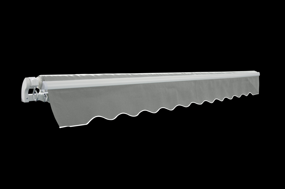 Markiza zawiera aluminiową rolkę, aluminiową belkę przednią, stalową belkę tylną i aluminiowe ramiona.