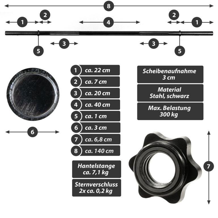 Optymalny gryf do użytku na siłowni i w domu, odpowiednia do treningu klatki piersiowej, ramion, ramion, szyi, wzmocnienia, sportów rehabilitacyjnych, kulturystyki, wyciskania na ławce, martwego ciągu, przysiadów, wypadów, pompek i innych. Nadaje się do dostępnych płyt obciążających z uchwytem tarczy 3 cm i otworem o średnicy 30/31 mm. Blopkada gwiazdowa, które można szybko wymienić, bezpiecznie mocują obciążniki na sztangi i zapewniają łatwą zmianę ciężaru. Uchwyty są żebrowane krzyżowo, co zapewnia pewny chwyt.
