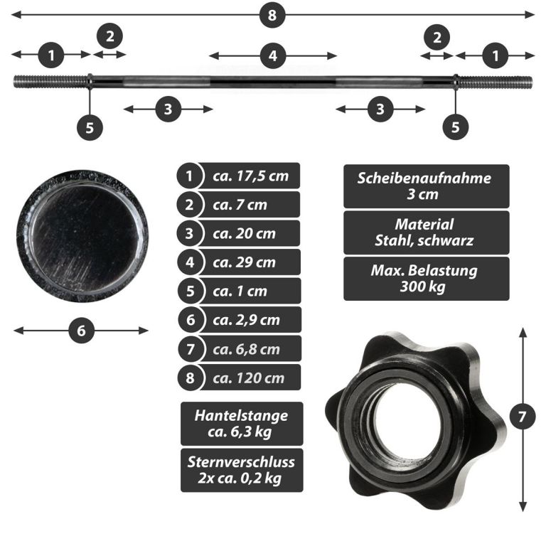 Optymalna sztanga do użytku na siłowni i w domu, odpowiednia do treningu klatki piersiowej, ramion, ramion, szyi, wzmocnienia, sportów rehabilitacyjnych, kulturystyki, wyciskania na ławce, martwego ciągu, przysiadów, wypadów, pompek i innych. Nadaje się do dostępnych płyt obciążających z uchwytem tarczy 3 cm i otworem o średnicy 30/31 mm. Blokada gwiazdowa, które można szybko wymienić, bezpiecznie mocują obciążniki na sztangi i zapewniają łatwą zmianę ciężaru. Uchwyty są żebrowane krzyżowo, co zapewnia pewny chwyt.