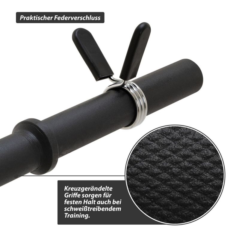 Optymalna sztanga do użytku na siłowni i w domu, odpowiednia do treningu klatki piersiowej, ramion, ramion, szyi, wzmocnienia, sportów rehabilitacyjnych, kulturystyki, wyciskania na ławce, martwego ciągu, przysiadów, wypadów, pompek i innych. Nadaje się do dostępnych płyt obciążających z uchwytem tarczy 3 cm i otworem o średnicy 30/31 mm. Sprężyny szybkowymienne mocują ciężarki bezpiecznie do sztangi i zapewniają łatwą zmianę ciężaru. Uchwyty są żebrowane krzyżowo, co zapewnia pewny chwyt.