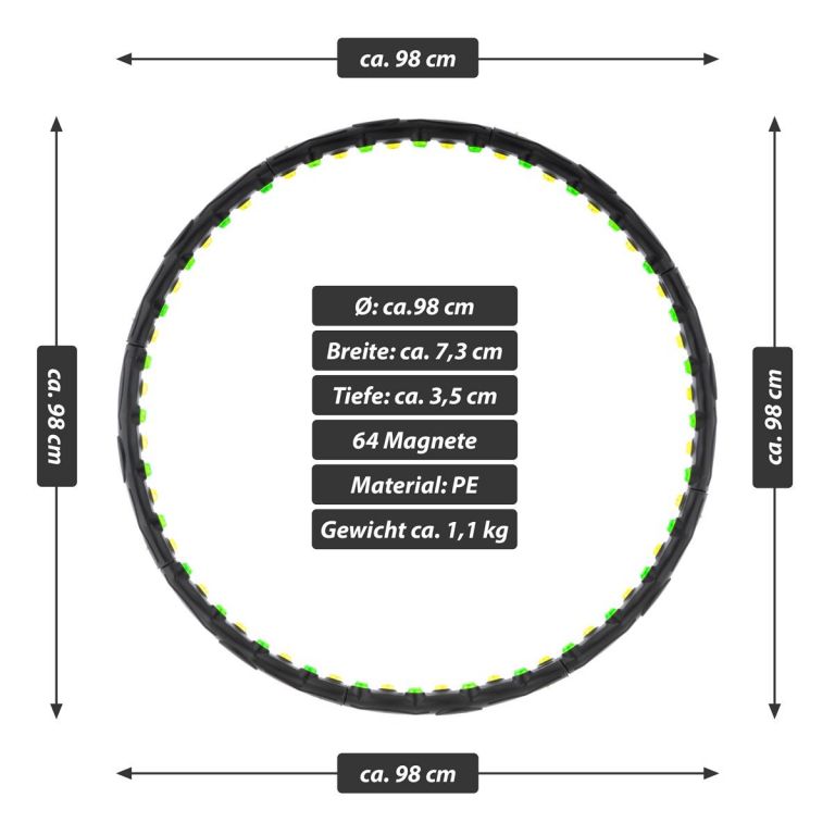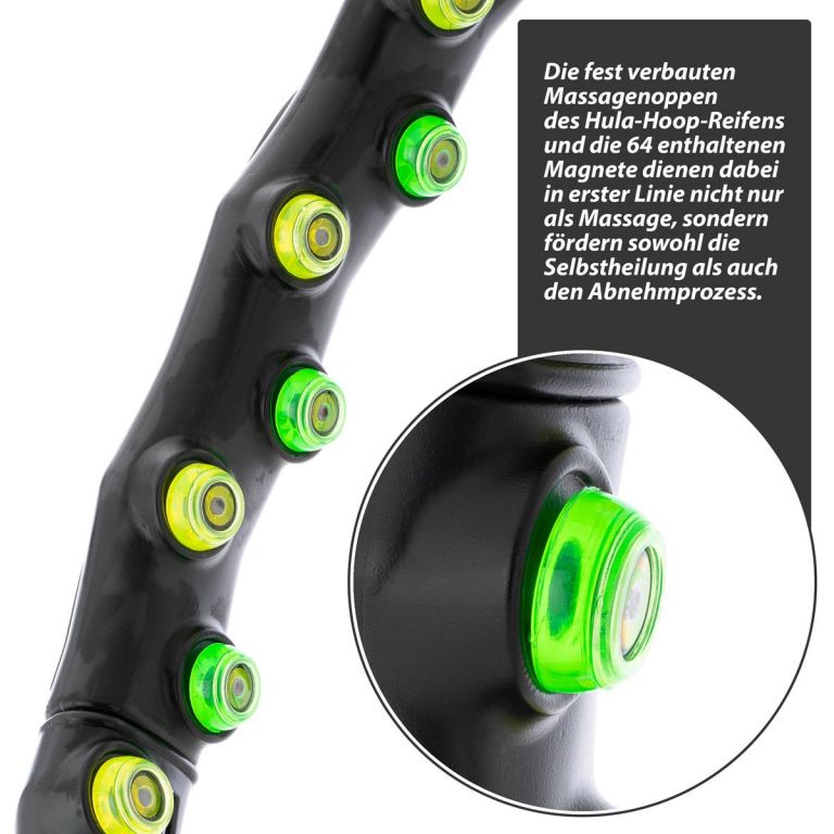 Zabudowane na stałe brodawki masujące i zawartych w nich 80 magnesów służą nie tylko do masażu, ale także do wspomagania samoleczenia i procesu odchudzania. Optymalna obręcz rozciąga się od podłogi w przybliżeniu do pępka. Pałąk można zabrać i używać praktycznie wszędzie, a poszczególne segmenty można złożyć w mgnieniu oka.
