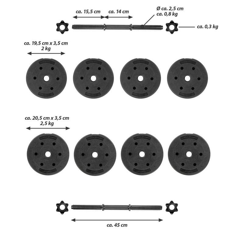 Nieważne czy ćwiczysz ramiona, plecy, brzuch czy bicepsy - nasz zestaw hantli jest uniwersalny. 2 hantle z bezpiecznym uchwytem wykonane z wysokiej jakości tworzywa sztucznego zapewniają bezpieczne i wygodne ćwiczenia. Dzięki powłoce z tworzywa sztucznego ciężarki te są delikatne dla podłogi, a w połączeniu z wypełnieniem cementowym są cichsze niż tradycyjne hantle. 4-gwiazdkowe zamki bezpiecznie zabezpieczają obciążniki. Radełkowane krzyżowo uchwyty wspierają bezpieczeństwo podczas treningu siłowego. Pozwala na obciążenie treningowe 10 kg na sztangę, które można zmieniać w zależności od osobistego poziomu treningu.