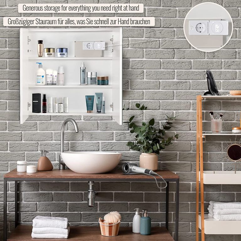 Ta stylowa szafka z lustrem posiada przełącznik dotykowy, funkcję ściemniania oraz zintegrowane gniazdo do podłączenia urządzeń elektrycznych.