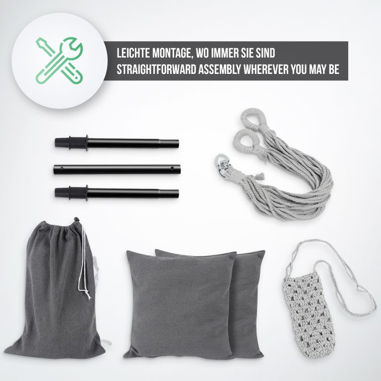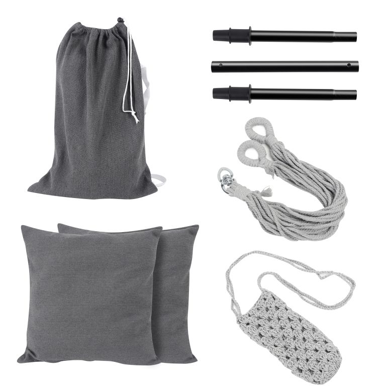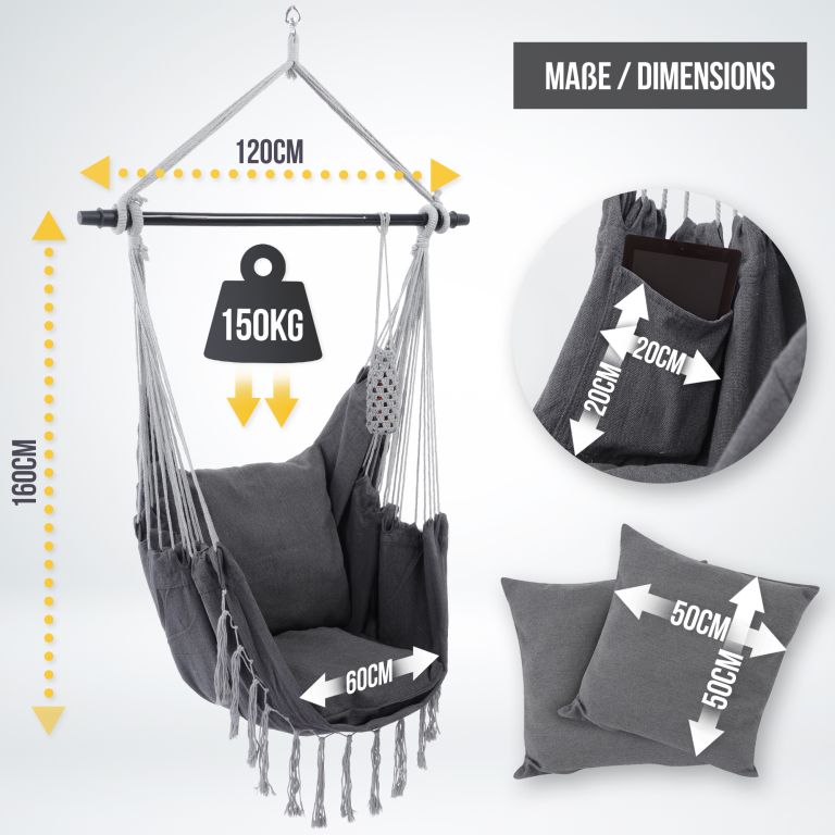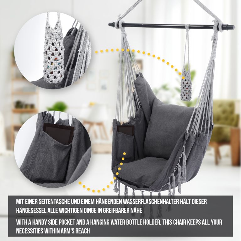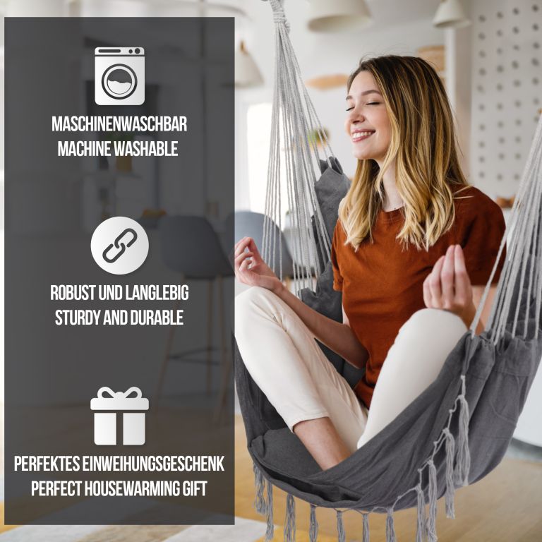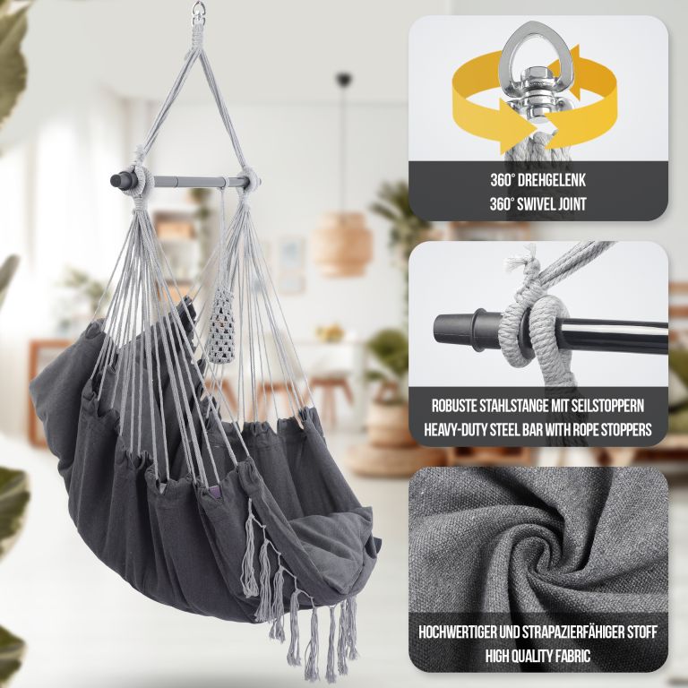 Ten wiszący fotel jest wykonany z trwałej mieszanki bawełny i poliestru i ma zdejmowane poszewki na poduszki, które można łatwo prać w pralce. Konserwacja tego wiszącego fotela jest naprawdę prosta. Ten wiszący fotel jest zamocowany na stalowym drążku rozporowym, dzięki obrotowemu przegubowi 360° można łatwo znaleźć wygodną pozycję siedzącą i cieszyć się maksymalnym komfortem. Pomimo wygodnej konstrukcji, ten wiszący fotel jest wykonany z trwałego materiału, który wytrzymuje codzienne zużycie i zapewnia długą żywotność.