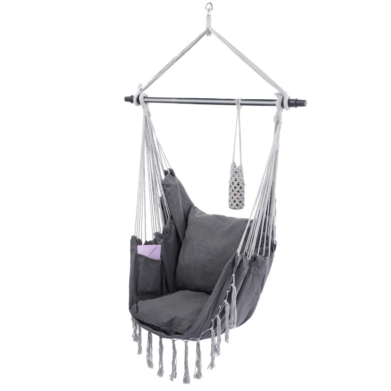 Po długim dniu w pracy możesz doskonale zrelaksować się w tym wiszącym fotelu z książką i filiżanką kawy, niezależnie od tego, czy jesteś w domu, czy na zewnątrz. Gdy usiądziesz wygodnie w tym wiszącym fotelu, nie będziesz chciał z niego zejść.