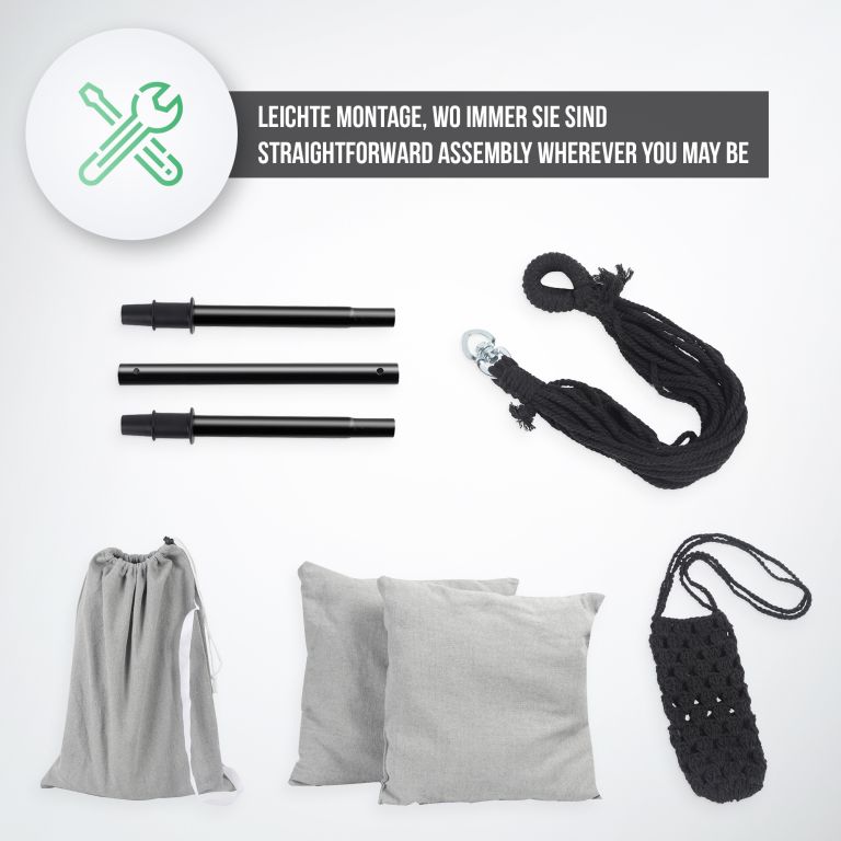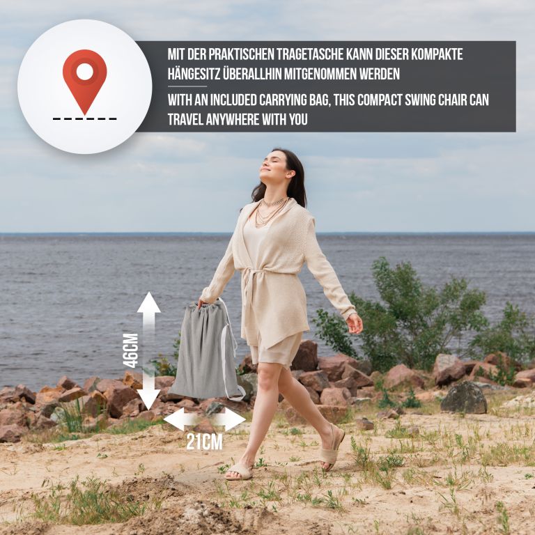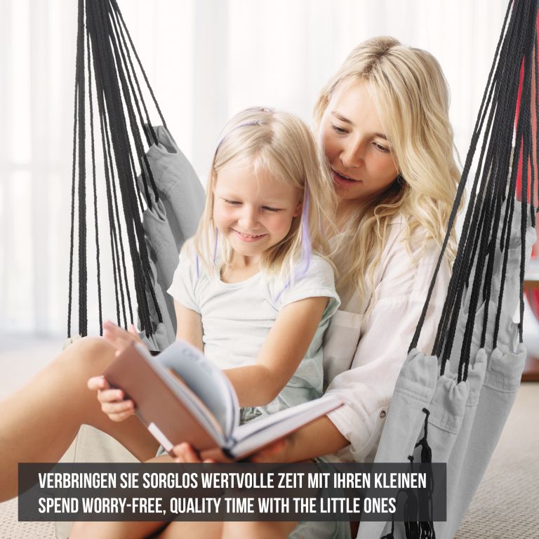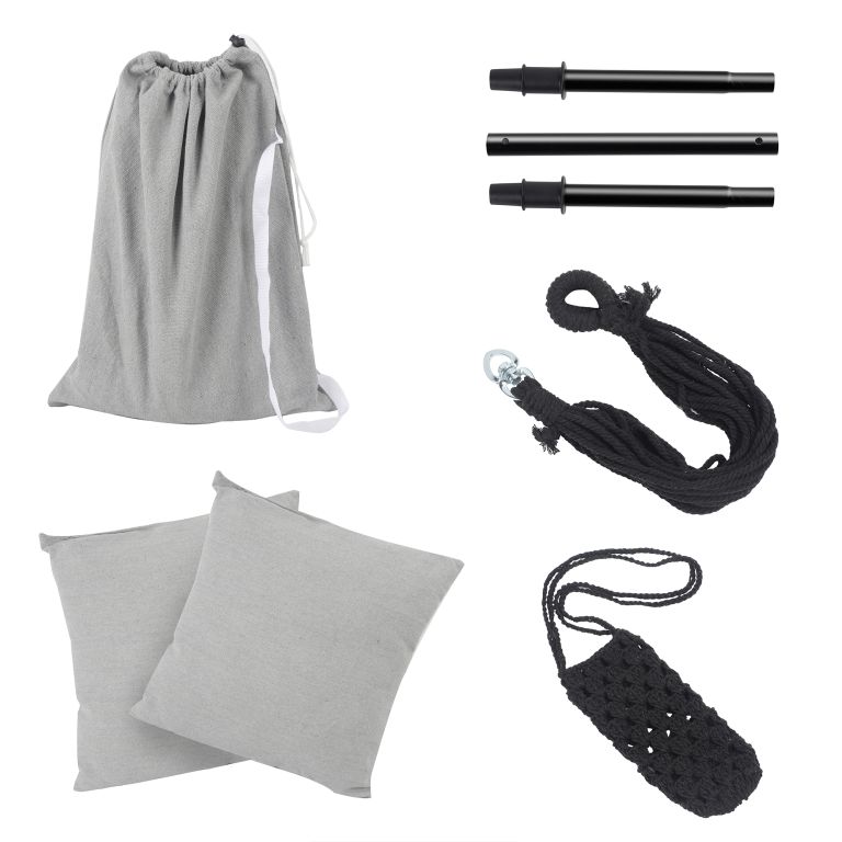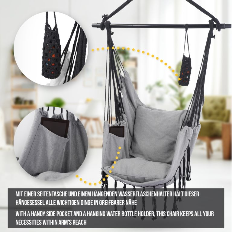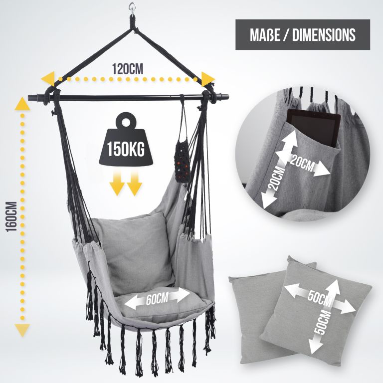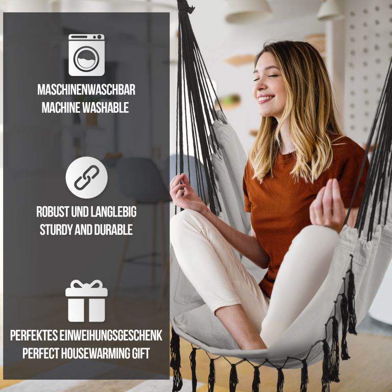 Ten wiszący fotel jest wykonany z trwałej mieszanki bawełny i poliestru i ma zdejmowane poszewki na poduszki, które można łatwo prać w pralce. Konserwacja tego wiszącego fotela jest naprawdę prosta. Ten wiszący fotel jest zamocowany na stalowym drążku rozporowym, dzięki obrotowemu przegubowi 360° można łatwo znaleźć wygodną pozycję siedzącą i cieszyć się maksymalnym komfortem. Pomimo wygodnej konstrukcji, ten wiszący fotel jest wykonany z trwałego materiału, który wytrzymuje codzienne zużycie i zapewnia długą żywotność.