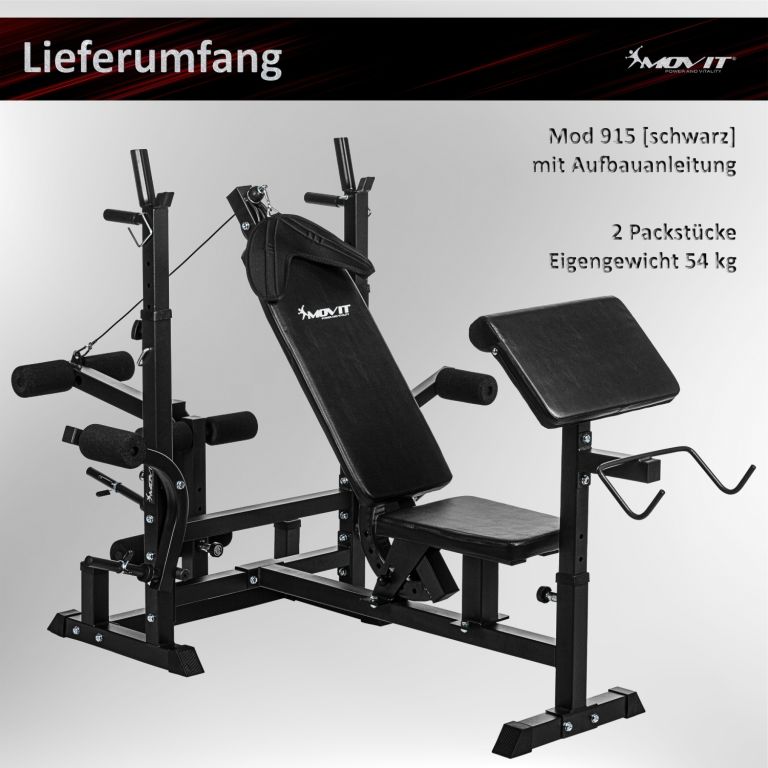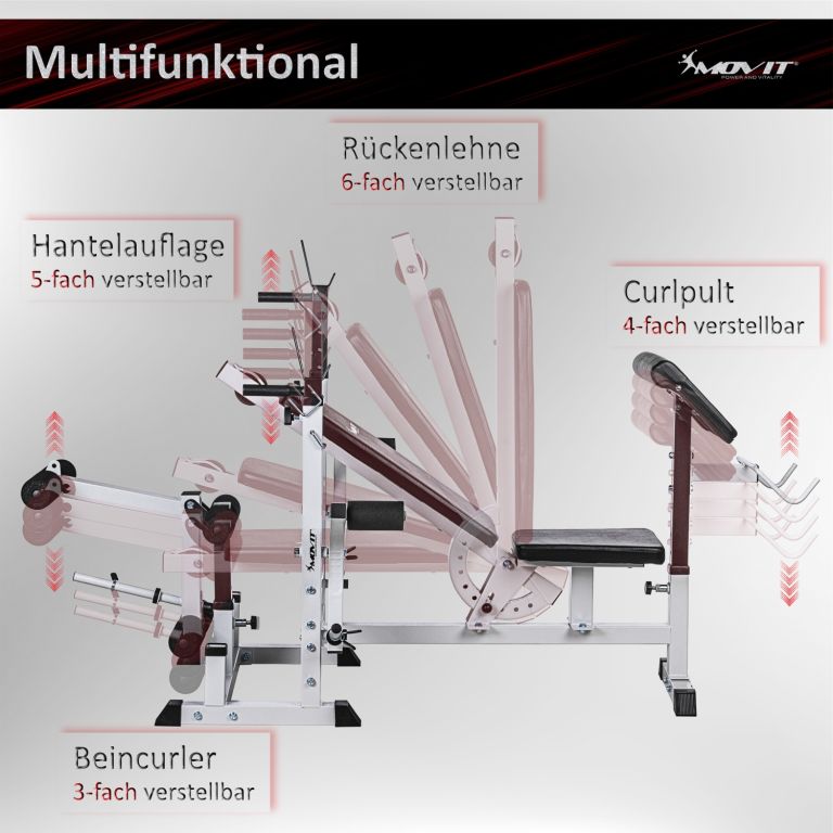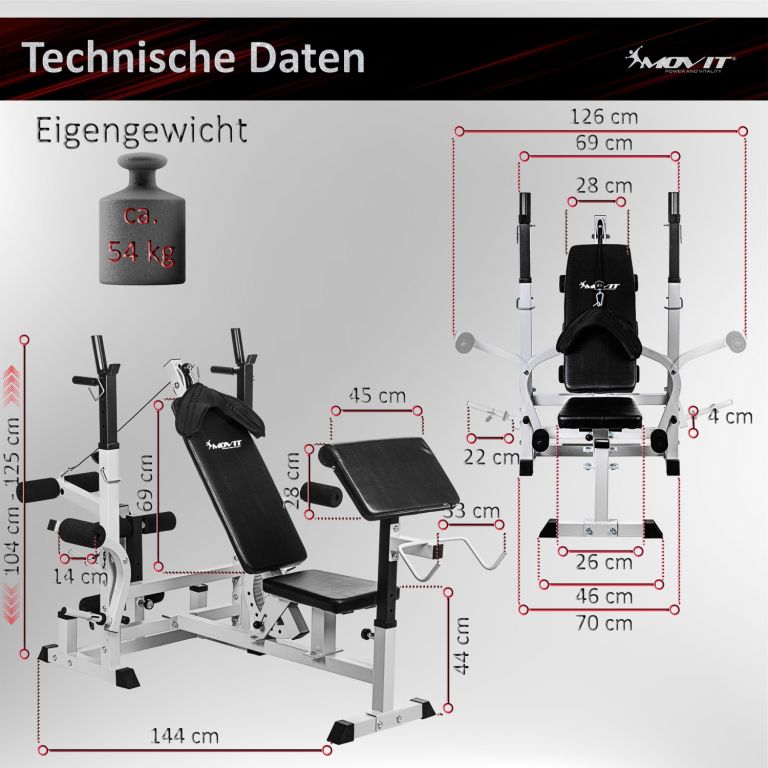 Połączona długa i pochylona ławka, wielostopniowa regulacja oparcia i stojaka pod sztangę, zintegrowany moduł krążka linowego, dwa uchwyty zanurzeniowe, dwa stojaki z tyłu na sprzęt, gumowane stabilne nogi. Długi stojak na sztangę (do 180 kg), ramiona motylkowe (do 40 kg każde), łatwo wymienny stojak na rolki i kleszcze do nóg (do 60 kg)